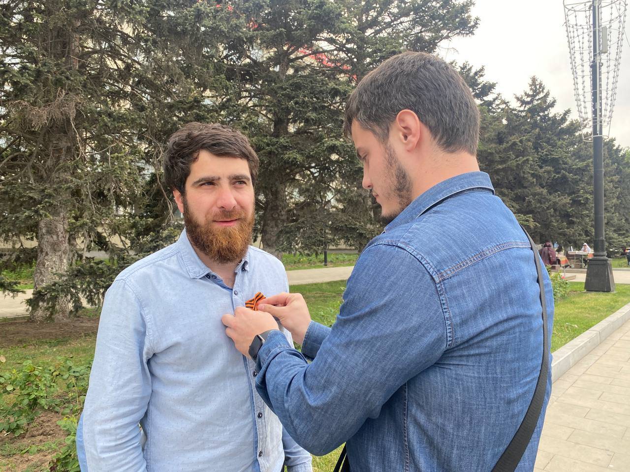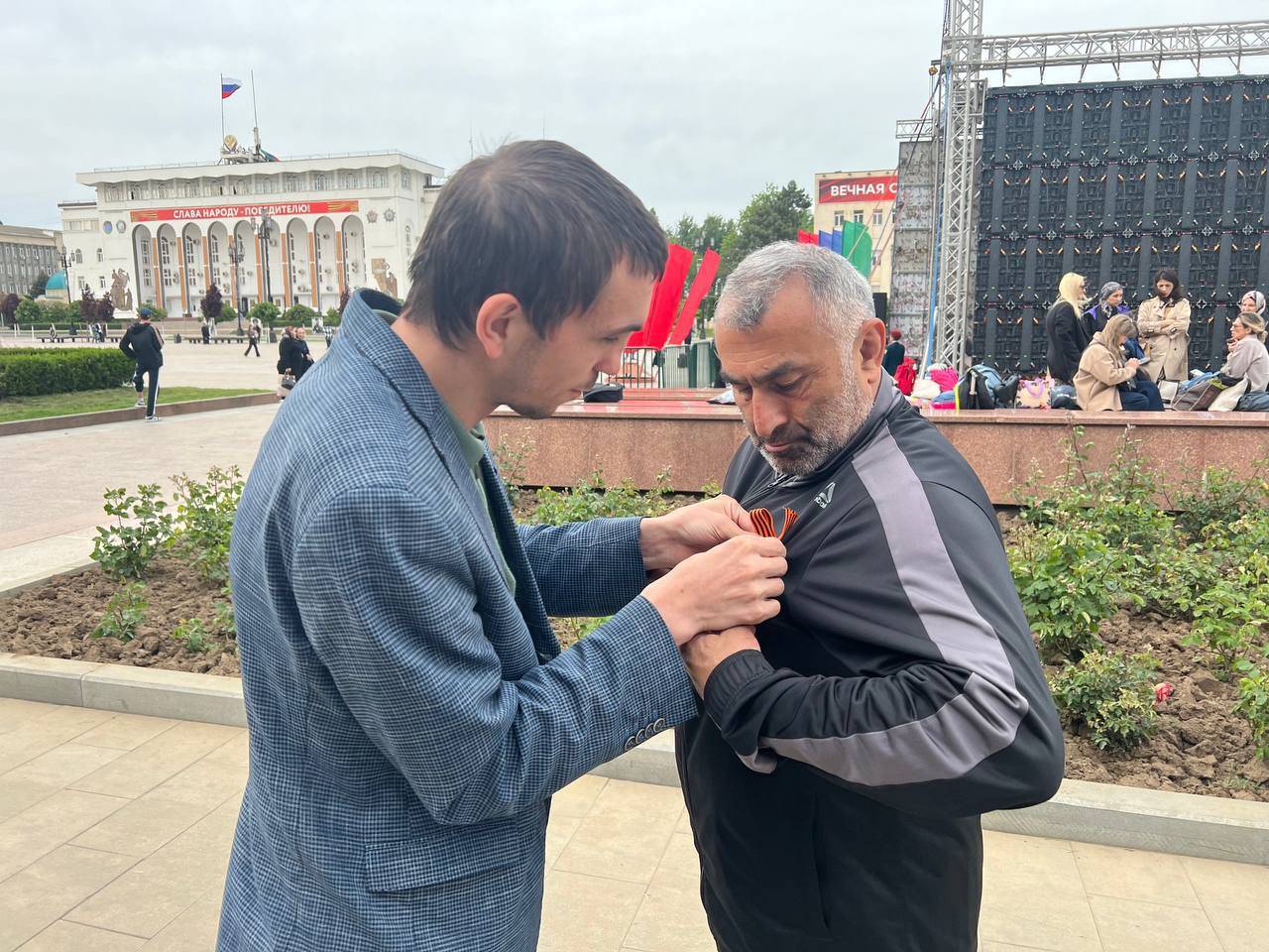 На центральной площади города Махачкалы представители Регионального отделения РВИО вручили горожанам и гостям столицы георгиевские ленточки как дань светлой памяти, уважения ветеранам, благодаря которым была одержана Великая Победа.