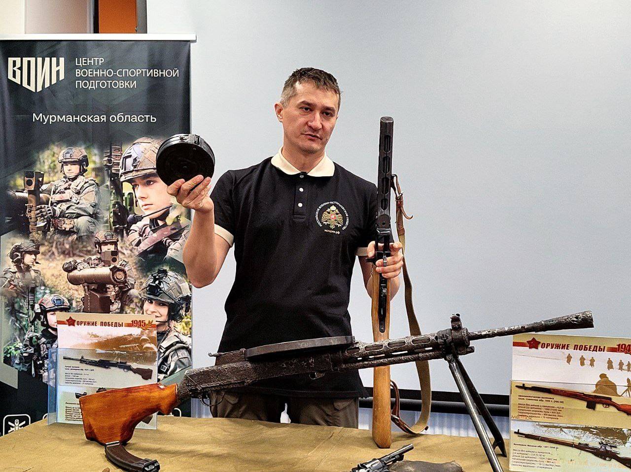 После лекции курсанты отправились на интерактивную площадку "Эхо войны. Оружие Победы". Здесь их ждала уникальная возможность – прикоснуться к подлинным артефактам времен Великой Отечественной войны и ощутить атмосферу тех лет. Проводником в прошлое стал Денис Павлович Васильев, военнослужащий, активный участник регионального отделения Российского военно-исторического общества (РО РВИО) в Мурманской области и член поискового отряда «Патриоты – наследники Победы». В доступной интерактивной форме лектор рассказал и продемонстрировал: русскую 3-линейную винтовку Мосина (пехотный вариант), русскую 3-линейную винтовку Мосина (снайперский вариант), автоматическую винтовку Симонова, пулемёт Дегтярёва (пехотный), револьвер системы Нагана, гранаты: РГД-33, Ф-1, РГ-42, M-24, M-39.