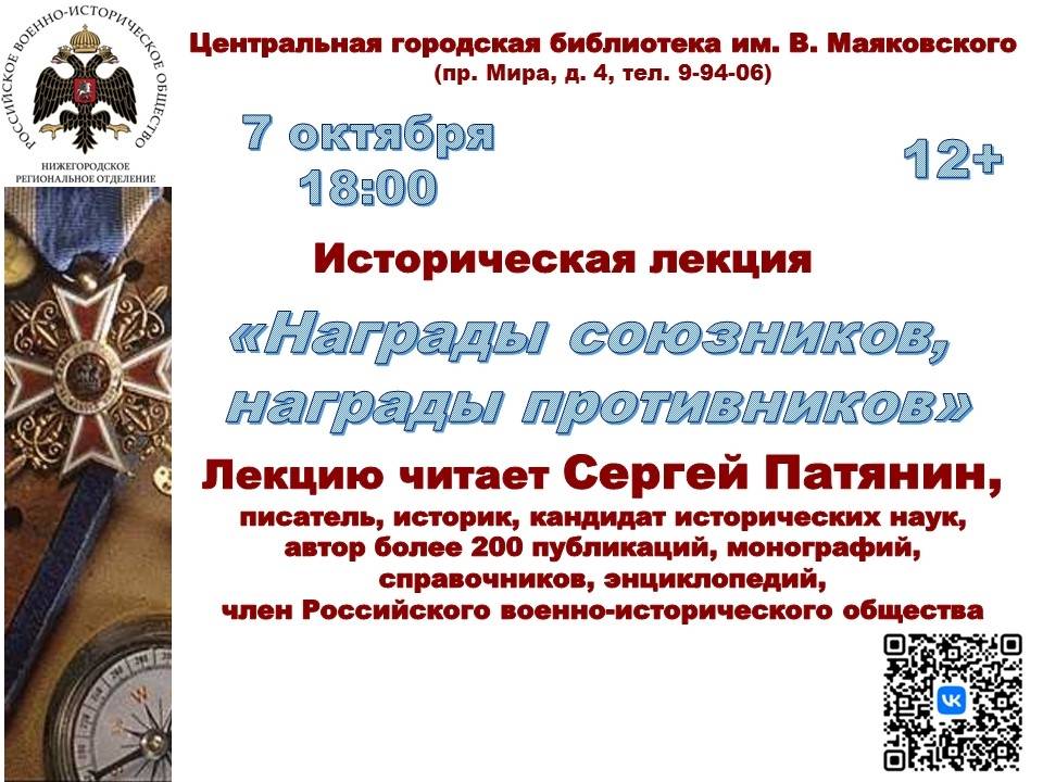 В г. Саров Нижегородской области 7 октября в 18.00 в Центральной городской библиотеке им. В. Маяковского состоится историческая лекция Сергея Патянина «Награды союзников, награды противников». На лекции в популярной форме будут рассмотрены награды союзников СССР – Великобритании и США, а также стран-противников – Германии и Италии, что позволит узнать интересные и уникальные факты об истории Второй мировой войны, о странах, принимавших в ней участие.