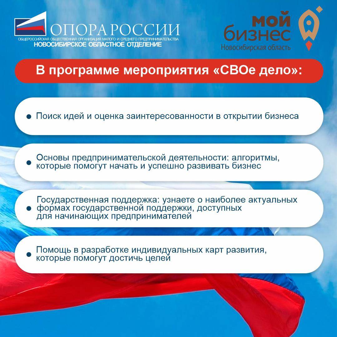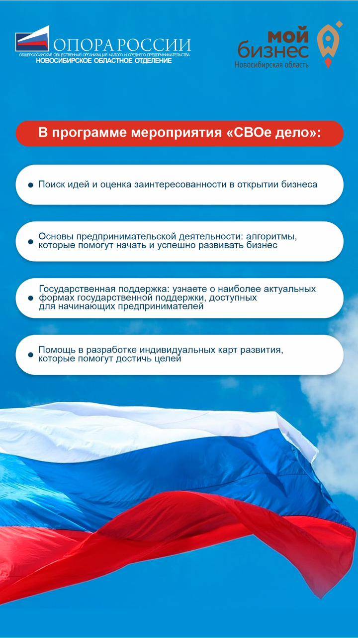 8 ноября в 14:00 Центр «Мой бизнес» Новосибирской области в сотрудничестве с Новосибирским областным отделением «ОПОРА РОССИИ» при поддержке Региональным отделением Российского военно-исторического общества в Новосибирской области, приглашает участников специальной военной операции, завершивших службу, и их семьи на обучающую программу «СВОё дело».