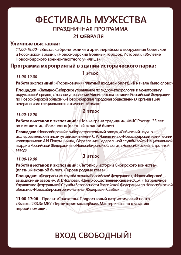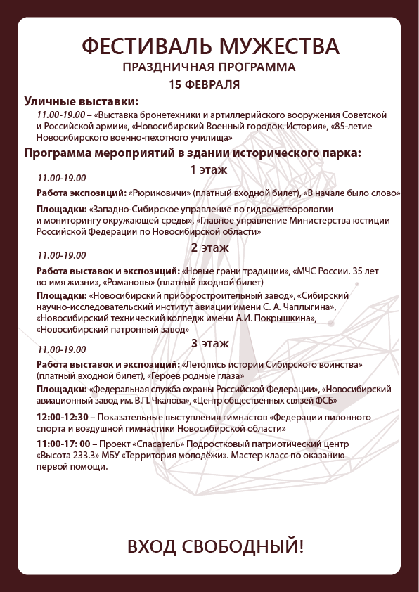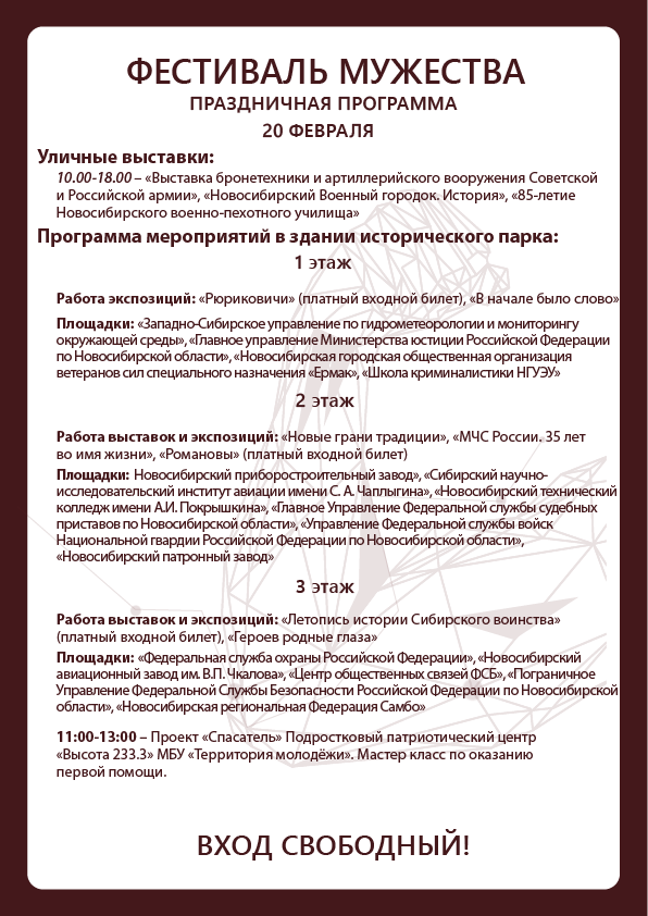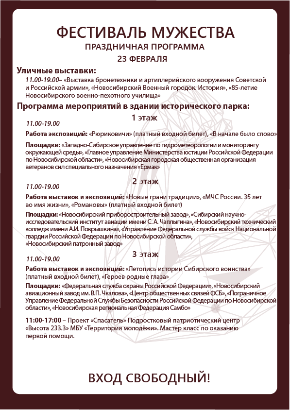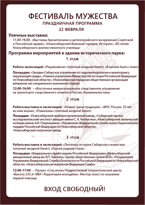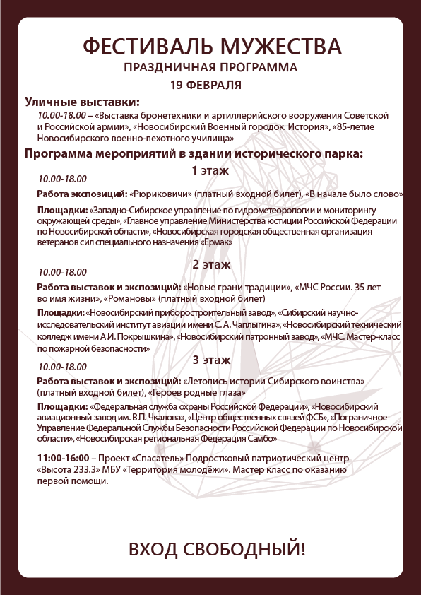Ежегодно, с 15 по 23 февраля в историческом парке «Россия – Моя история» проходит «Фестиваль Мужества». Этот праздник посвящен героям нашего Отечества —людям отважных профессий в самых разных сферах жизни: спасателям, спортсменам, военнослужащим, авиаторам, лётчикам, инженерам и многим другим профессионалам, которые спасают и защищают нас и нашу страну.