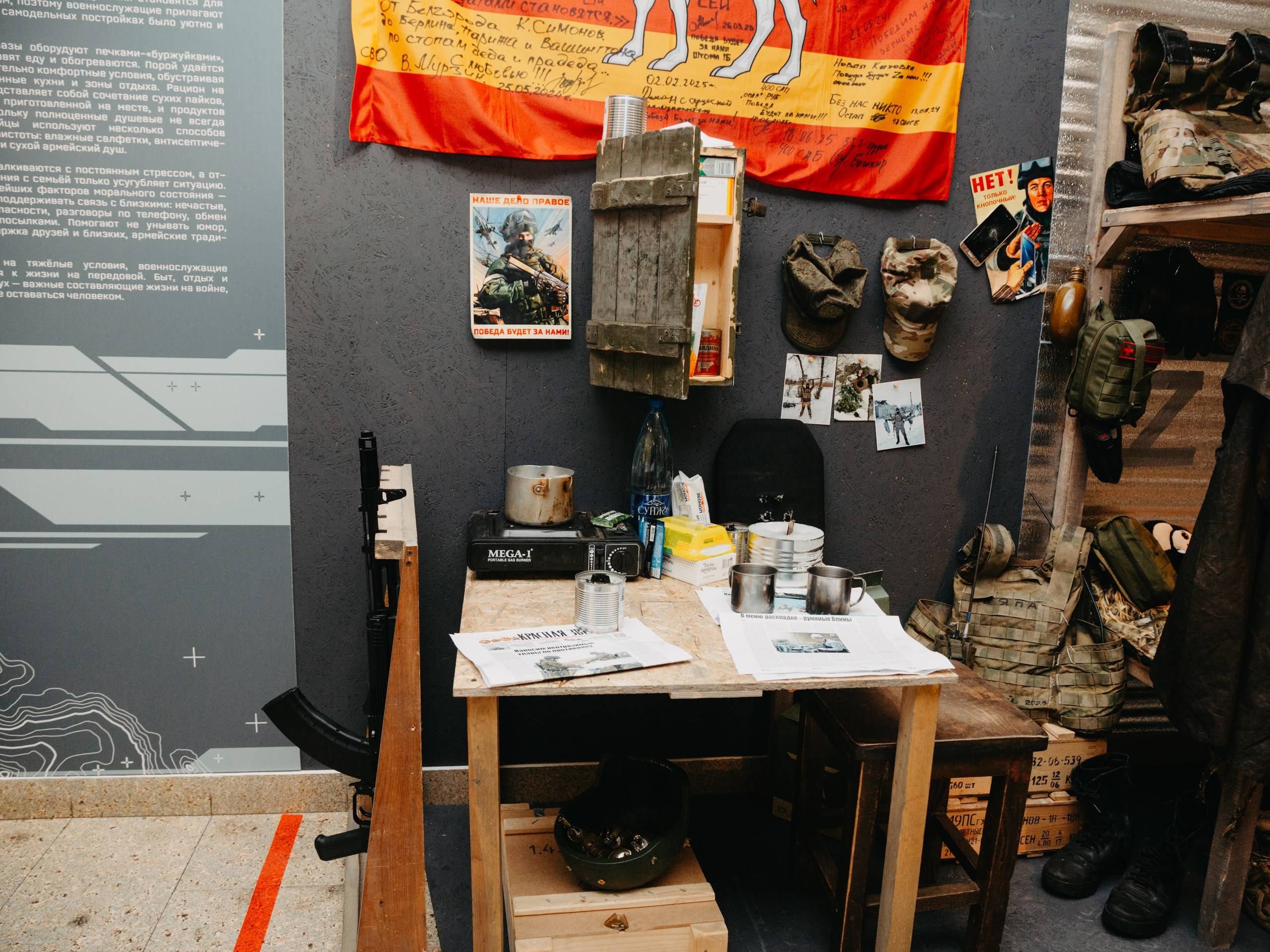 Новосибирский исторический парк «Россия — Моя история» с готовностью откликнулся на просьбу коллег и предоставил для экспонирования реликвии современной русской воинской славы — предметы с линии фронта. Эти предметы были собраны сотрудниками нашего парка при активной поддержке регионального отделения Российского военно-исторического общества в Новосибирской области и переданы нам бойцами из самых разных соединений и подразделений.