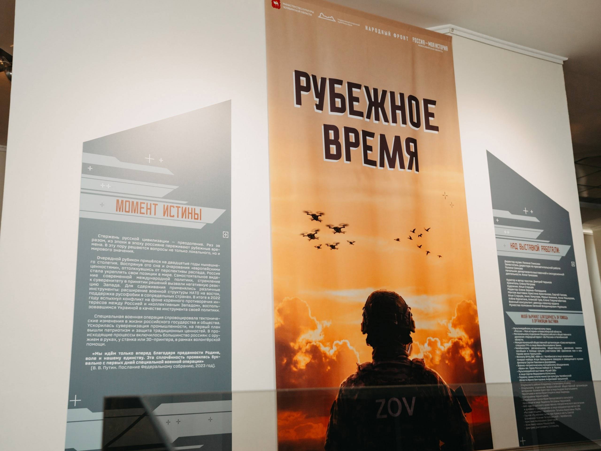 В День защитника Отечества, 23 февраля, в городе Челябинске, на площадке Государственного музея истории Южного Урала, состоялось открытие выставки «Рубежное время», посвящённой истории специальной военной операции, героизму и мужеству российских воинов, а также самоотверженности волонтёров и добровольцев.