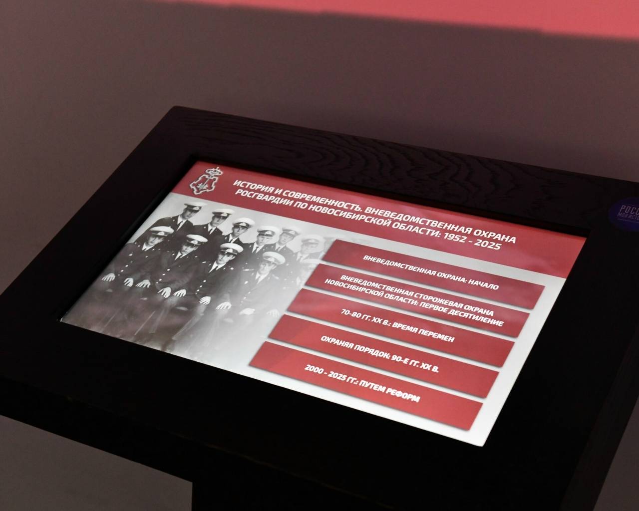 Мультимедийная выставка «История и Современность. Вневедомственная охрана Росгвардии по Новосибирской области: 1952-2025» посвящена истории формирования и развития вневедомственной охраны Новосибирской области, освещает ключевые этапы становления от советского периода до современности, а также раскрывает роль подразделения в общей структуре Федеральной службы войск национальной гвардии Российской Федерации (Росгвардии).