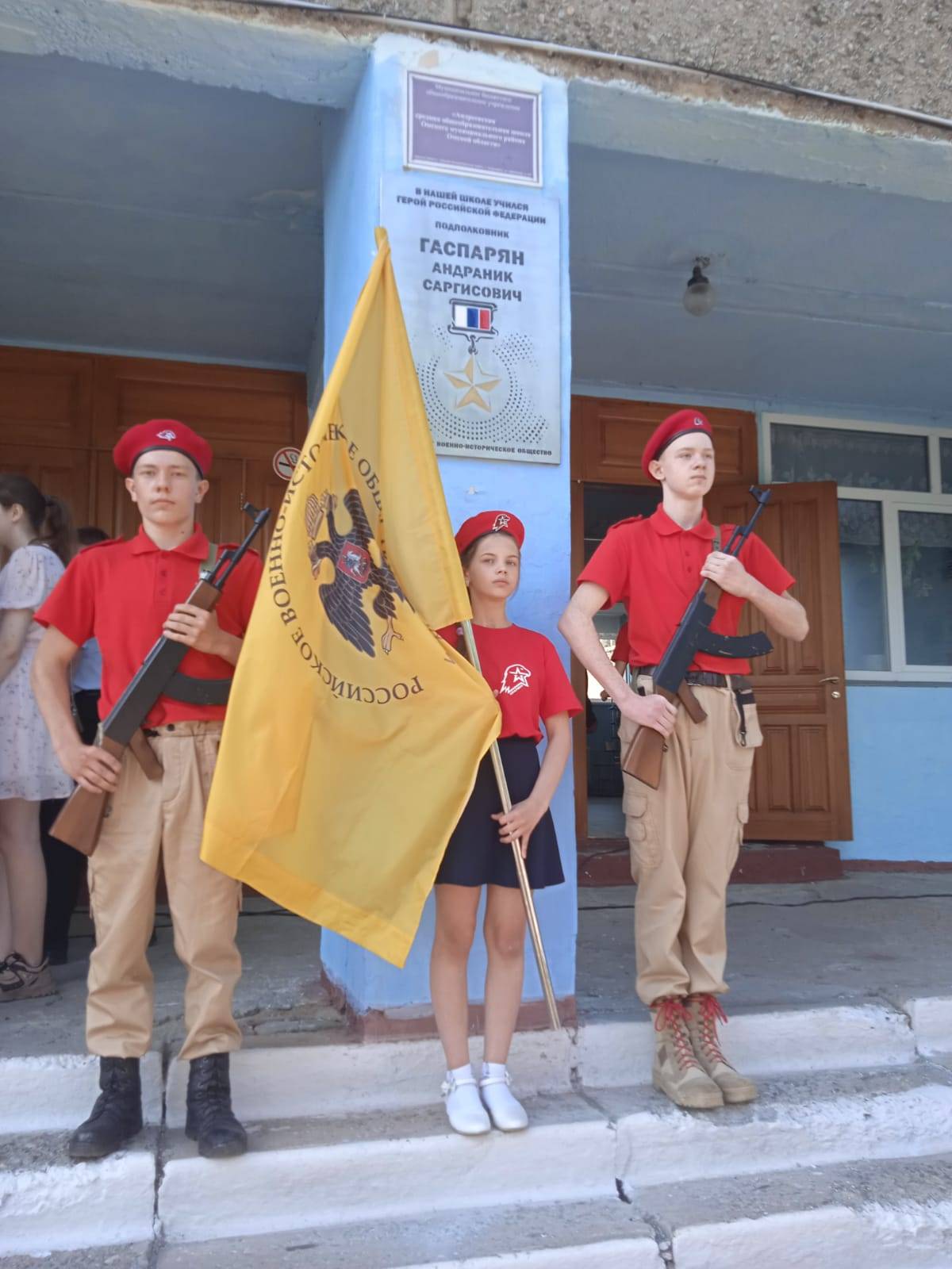На торжественной церемонии выступили Министр региональной безопасности А.И. Кондин, глава Омского района Г. Г. Долматов, депутат Законодательного Собрания Омской области                        С. А. Энверова, дядя героя О. В. Гаспарян, юнармейцы, представители армянского диаспоры, педагоги и учащиеся школы.