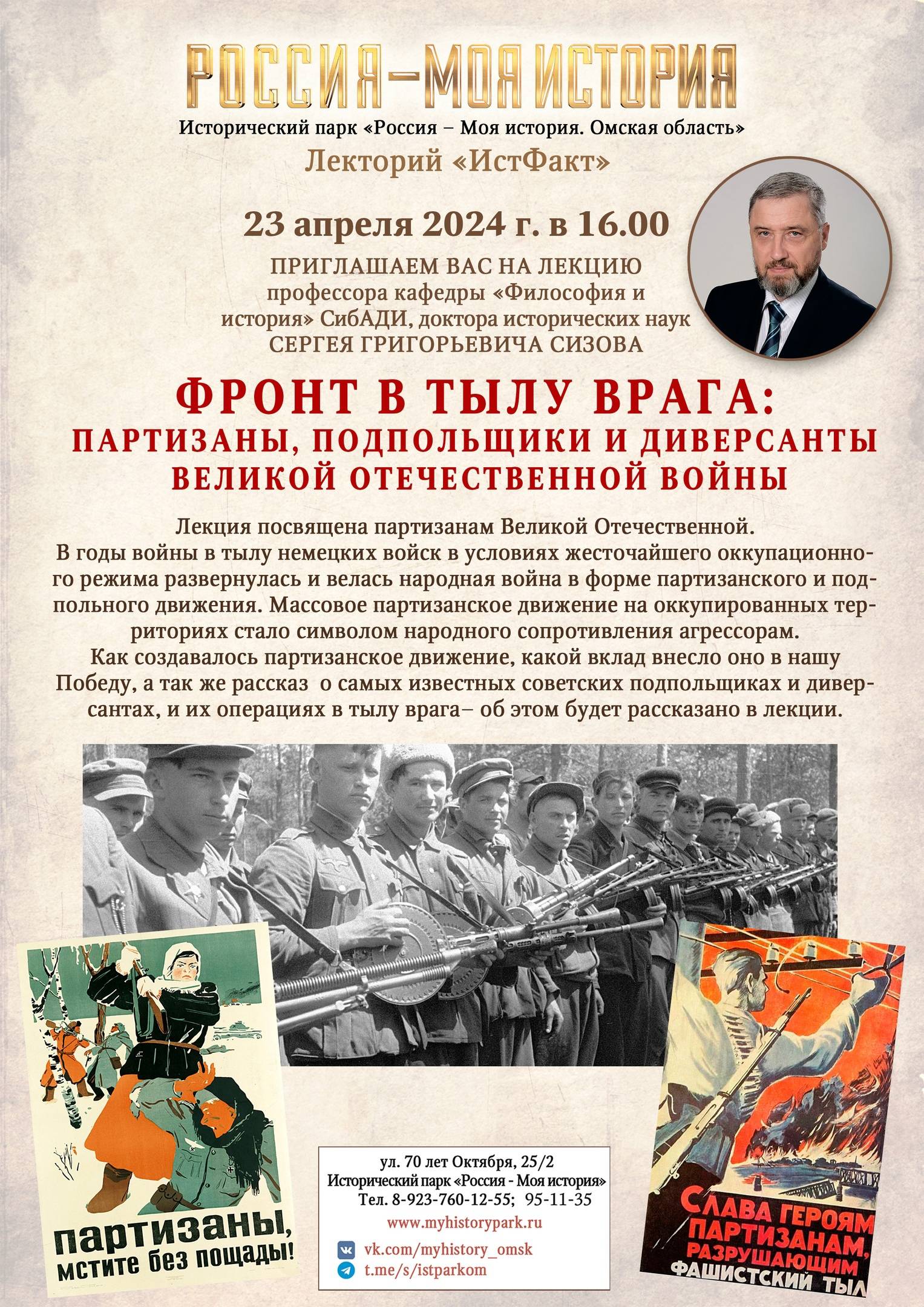 23 апреля в Историческом парке "Россия - моя история" в Омске состоялась лекция доктора исторических наук, профессора Сергея Григорьевича Сизова "Фронт в тылу врага: партизаны, подпольщики и диверсанты Великой Отечественной войны"
