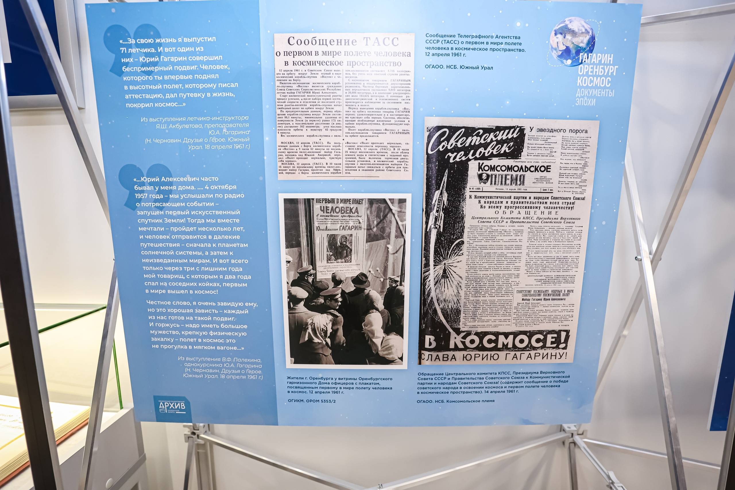 Посетителям выставки были представлены уникальные кадры, снятые Куйбышевской студией кинохроники из собрания Российского государственного архива кинофотофонодокументов, запечатлевшие первый послеполетный визит Юрия Гагарина в г. Оренбург в июне 1961 г.