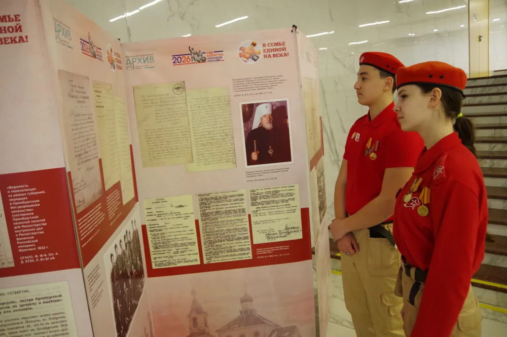 27 февраля 2026 г. в ДКиС «Газовик» был дан старт Году единства народов России. В рамках торжественного мероприятия Объединенный государственный архив Оренбургской области презентовал выставку архивных документов «В семье единой на века!».