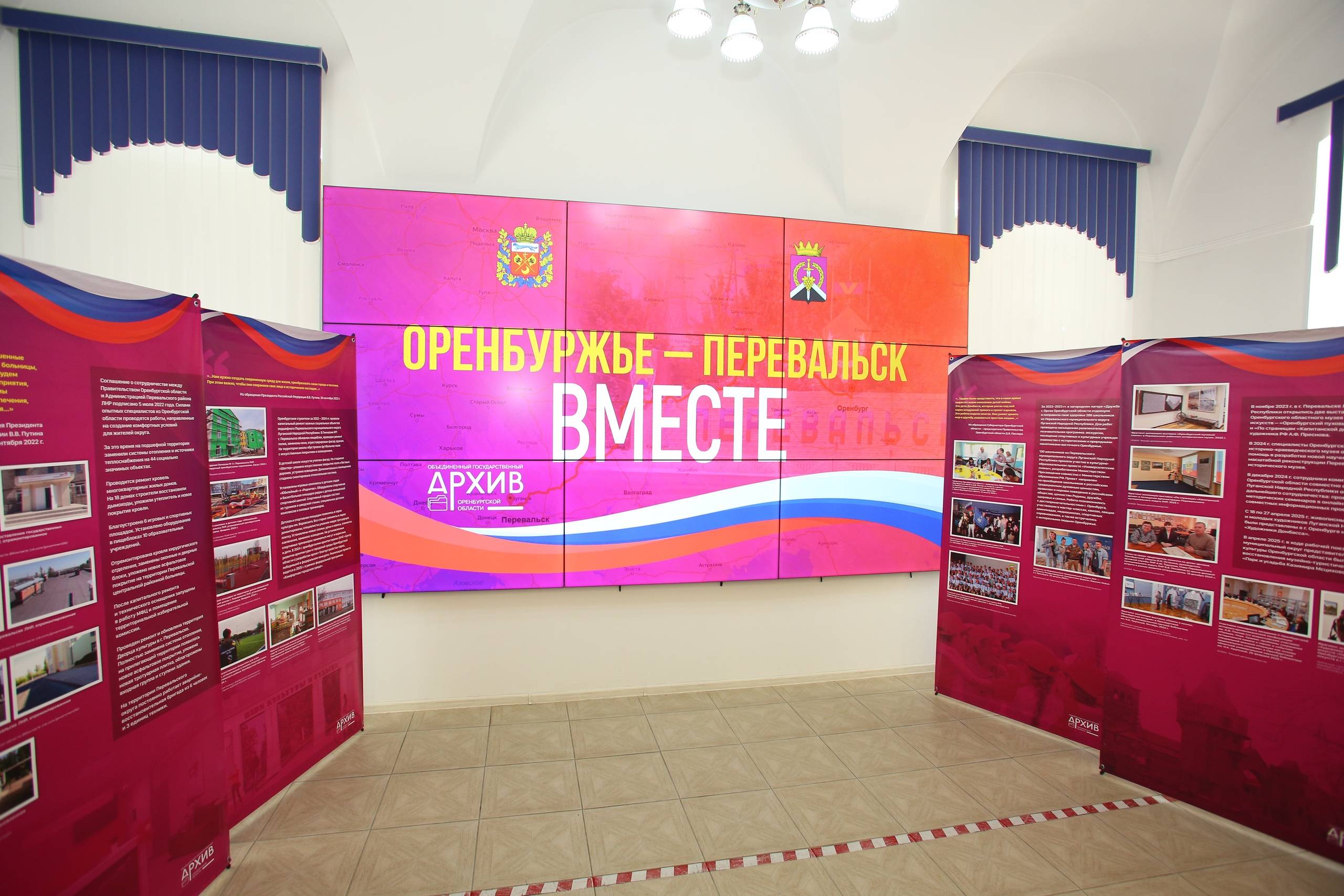 В рамках мероприятия состоялась презентация выставки «Оренбуржье – Перевальск. Вместе». Посетителям выставки были представлены фотографии, отражающие масштабы работы по восстановлению объектов социальной инфраструктуры г. Перевальска Луганской Народной Республики, осуществленной строителями, сотрудниками жилищно-коммунального хозяйства и членами различных общественных организаций Оренбуржья, а также фотографии мероприятий, проведенных в г. Перевальске ведущими творческими коллективами и учреждениями культуры Оренбургской области, среди них – выступление солистов Оренбургского русского народного хора с артистами ансамбля «Раздолье» Луганской академической филармонии, выступление артистов Оренбургского театра музыкальной комедии во Дворце культуры г. Перевальска Луганской Народной Республики в рамках празднования Дня России.