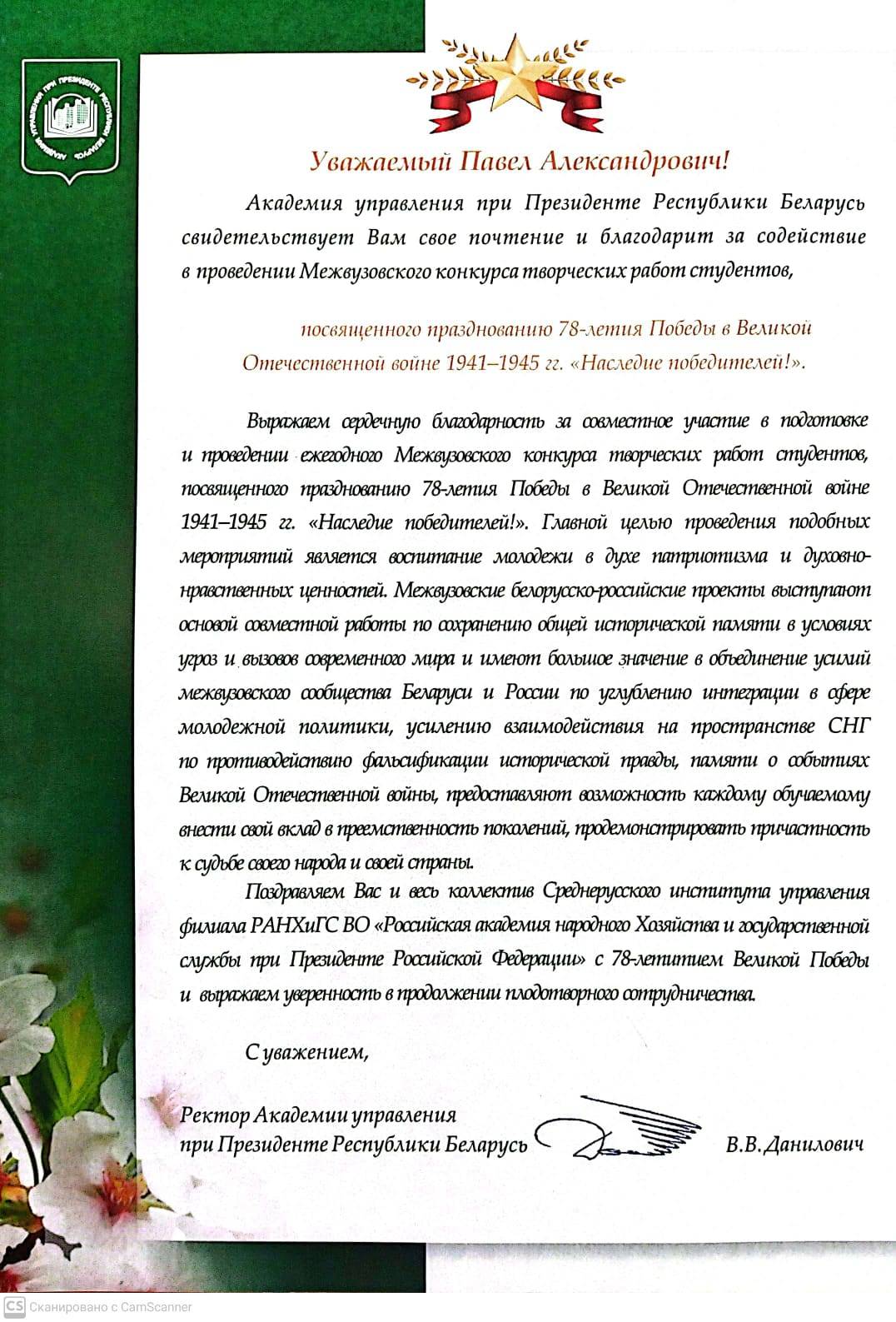 Академия управления при Президенте республики Беларусь выражает Благодарность Меркулову Павлу Александровичу за совместное участие в подготовке и проведении ежегодного Межвузовского конкурса творческих работ студентов, посвященного празднованию 78-летия Победы в Великой Отечественной войне 1942-1945 гг. «Наследие победителей!»