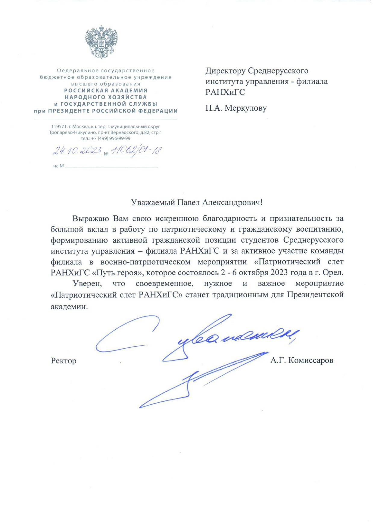 Ректор Президентской академии Алексей Комиссаров выразил благодарность директору Среднерусского института управления – филиала РАНХиГС Павлу Меркулову за большой вклад в работу по патриотическому и гражданскому воспитанию, формированию активной гражданской позиции студентов Президентской академии в Орле и за активное участие команды филиала в военно-патриотическом мероприятии «Патриотический слет РАНХиГС «Путь героя».