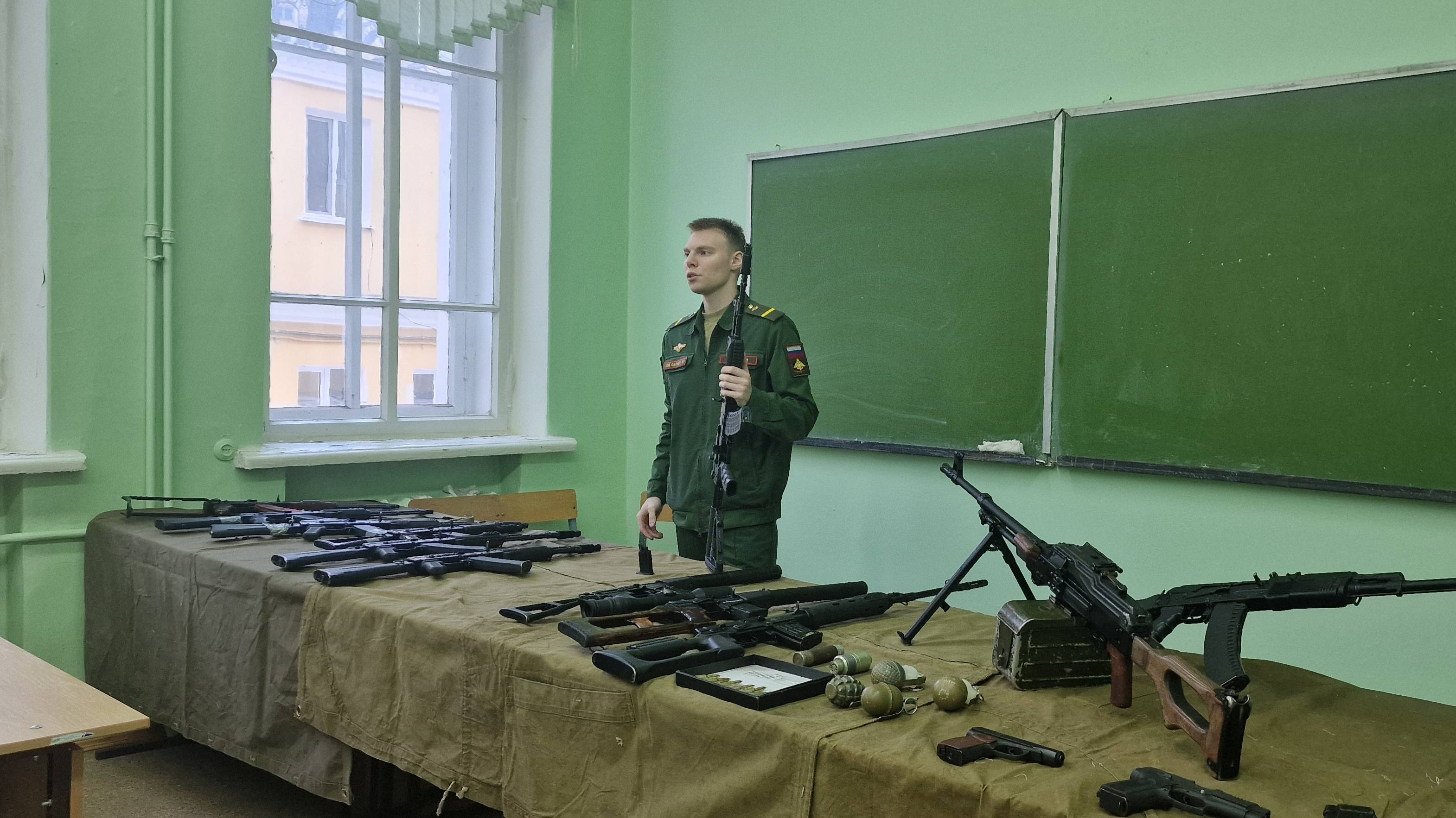 Курсы проходили в рамках работы пяти тематических площадок. Первая была посвящена современному оружию и системам вооружения. Студентам рассказали о строении различных видов оружия, а также о тактике и способах его применения. На стенде было представлено более 20 образцов современного вооружения, используемого ВС РФ.
