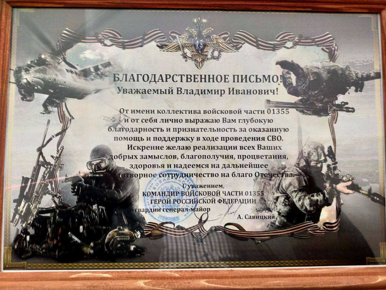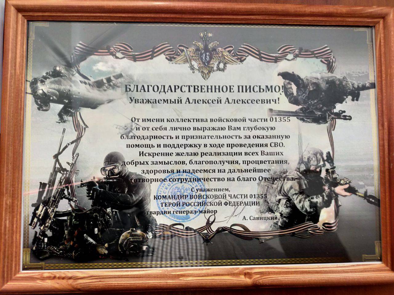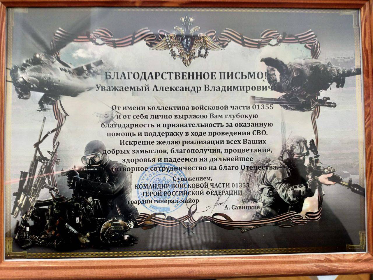 За помощь и поддерждку в ходе проведения СВО благодарственными письмами Героя Российской Федерации, генерала-майора Андрея Савицкого награждены: руководитель регионального отделения РВИО, директор Среднерусского института упарвления - филиала РАНХиГС Павел Меркулов, а также актвисты регионеального отделения РВИО: Александр Щеголев, Алексей Шалыгин, Владимир Шашков.