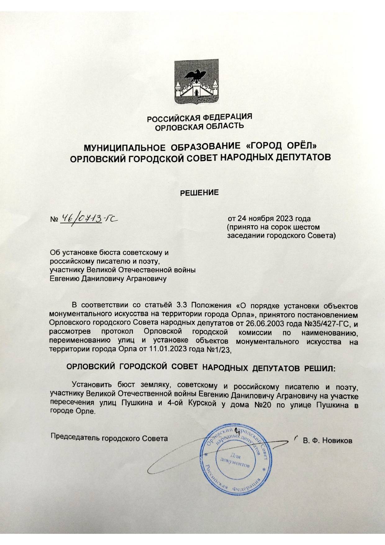 24 ноября текущего года на заседании Орловского городского Совета депутаты поддержали решение об установке бюста знаменитому земляку Евгению Аграновичу.