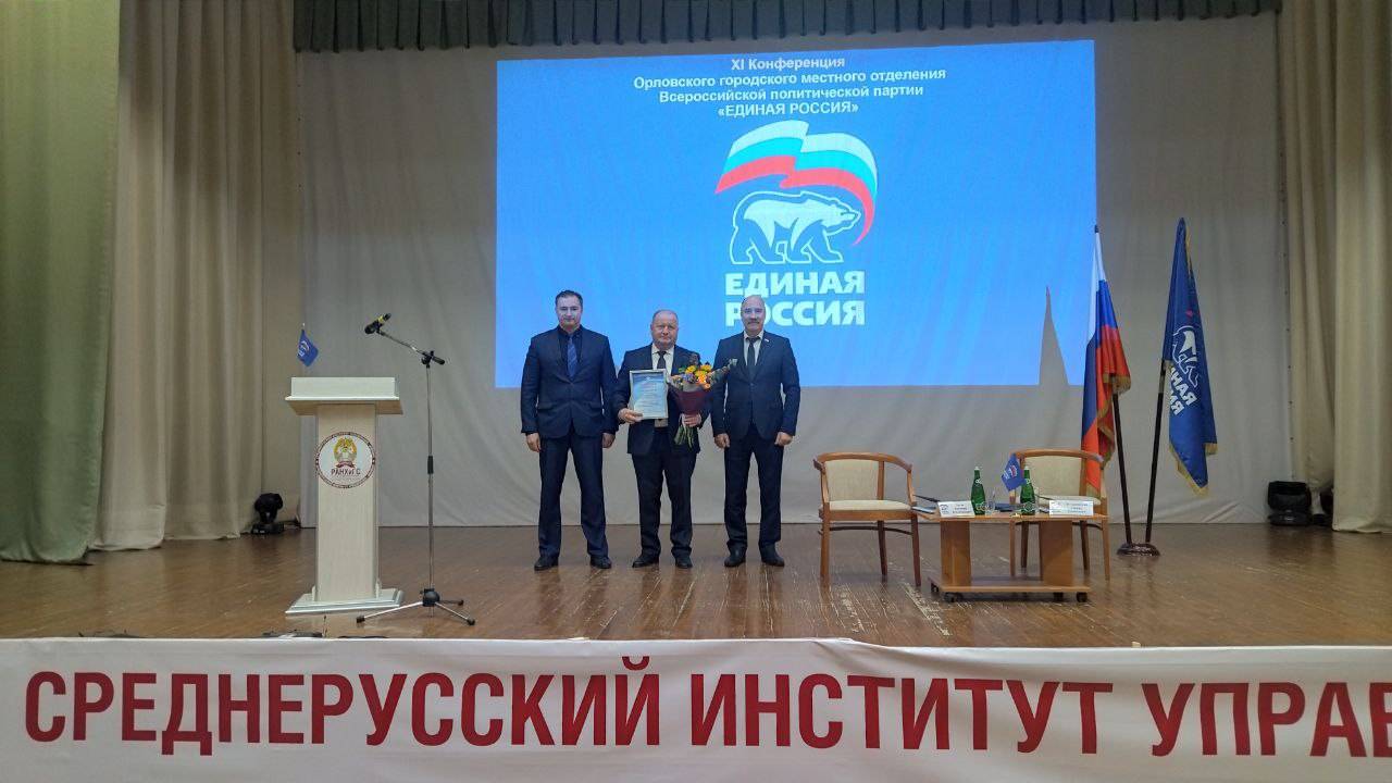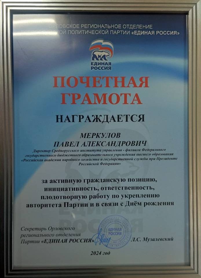 Руководитель регионального отделения РВИО в Орловской области, директор Среднерусского института управления - филиала РАНХиГС Павел Меркулов награжден почетной грамотой Орловсокго регионального отделения Партии "Единая Россия" за активную гражданскую позицию, инициативность, отвественность, плодотворную работу по укреплению авторитета Партии и в связи с Днем Рождения.