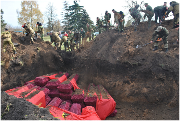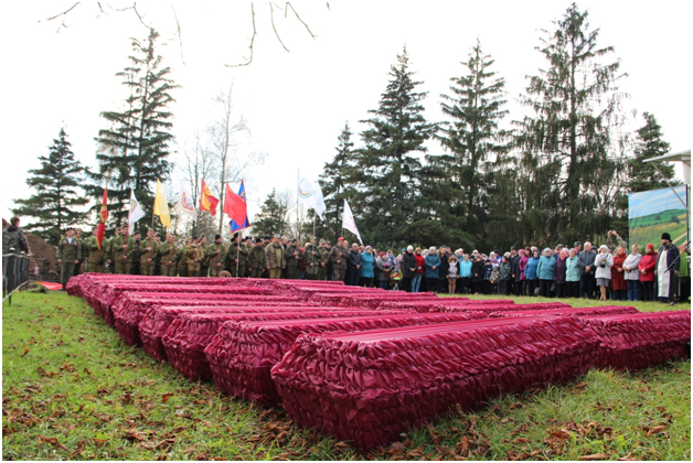 Останки павших воинов были уложены в 40 стандартных деревянных гробов и торжественно захоронены 18 октября 2022 года в д. Топки.