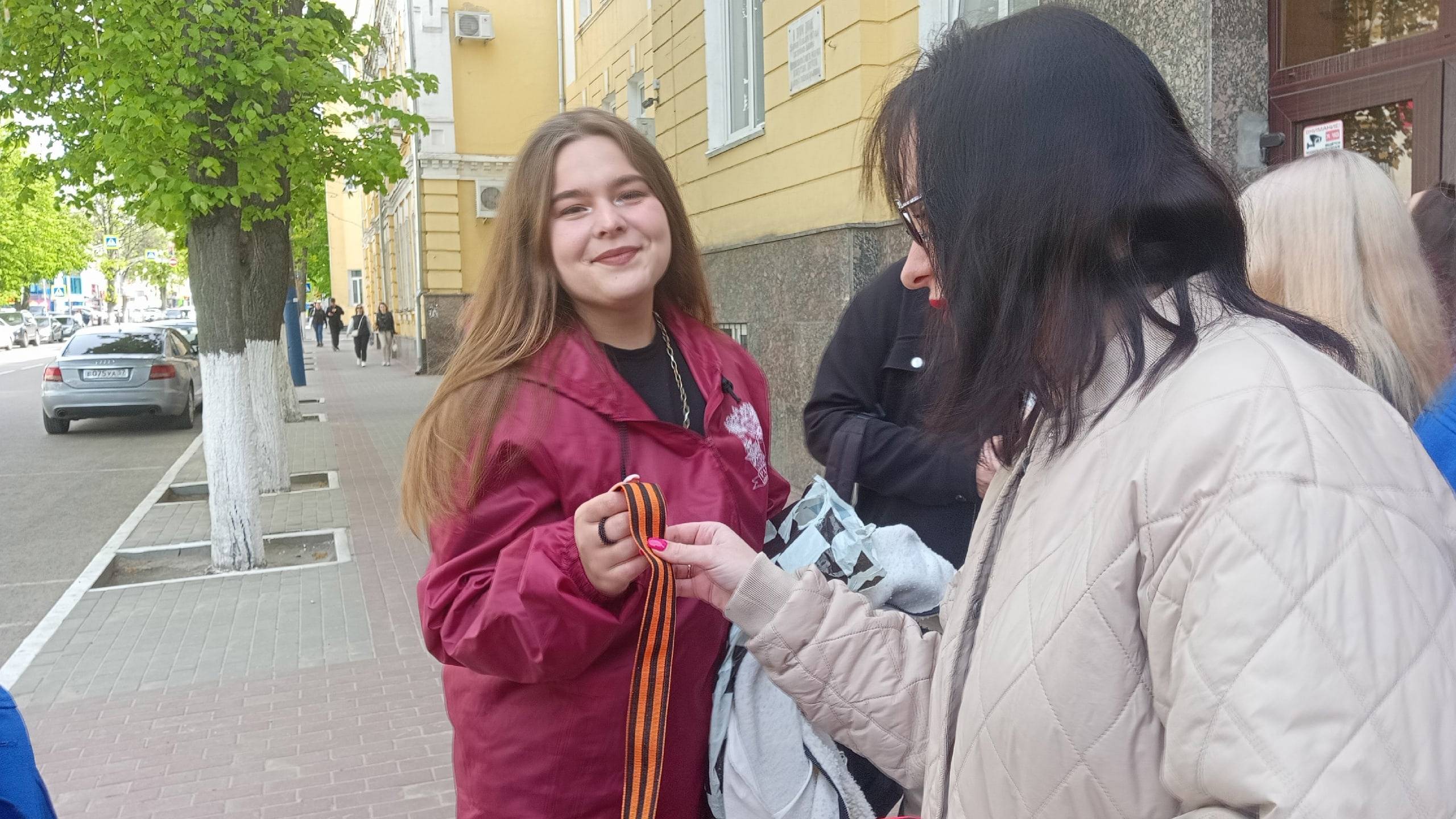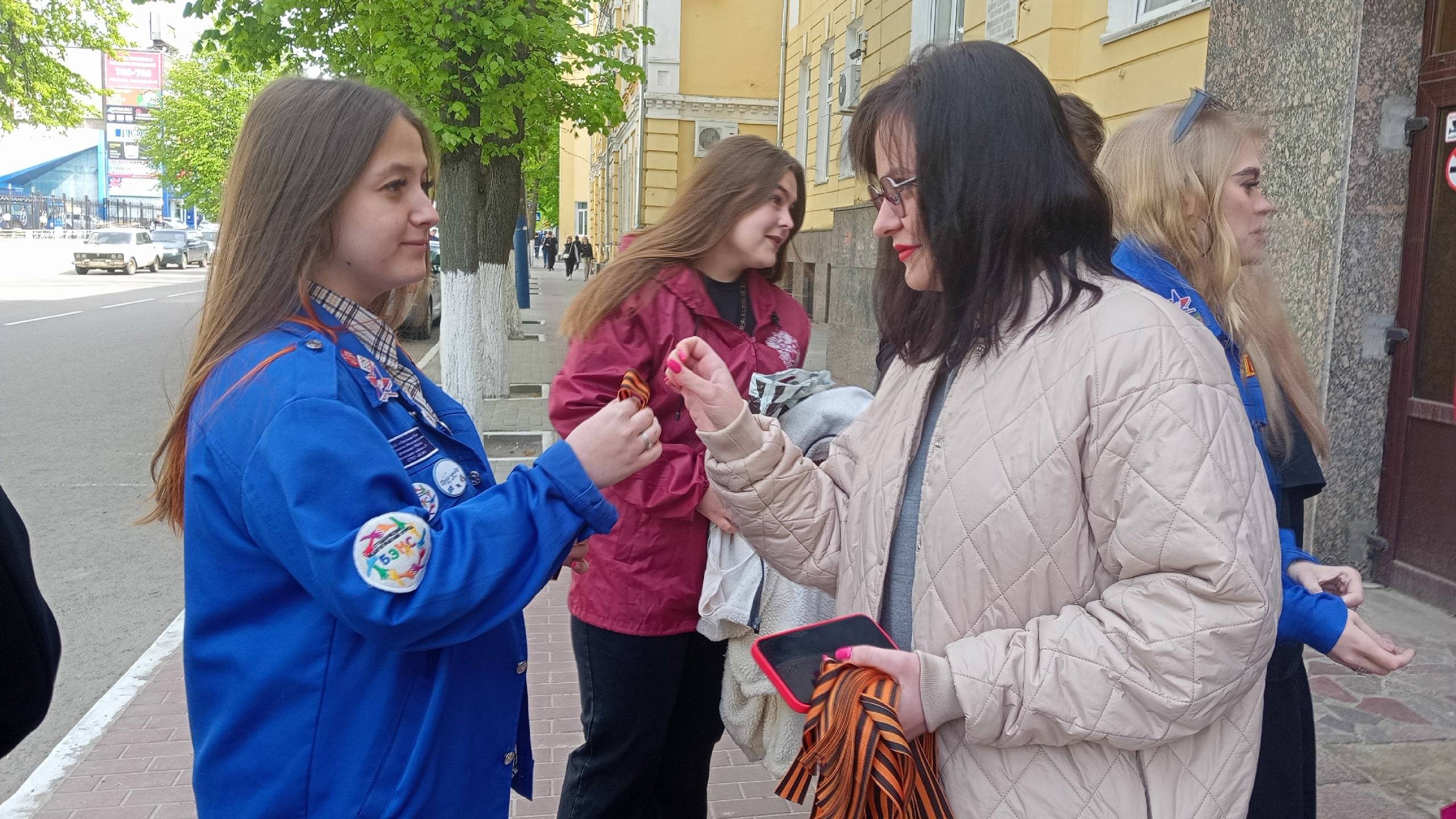 На городских улицах, в парках и скверах студенты и активисты раздовали орловчан Георгиевской ленточкой.