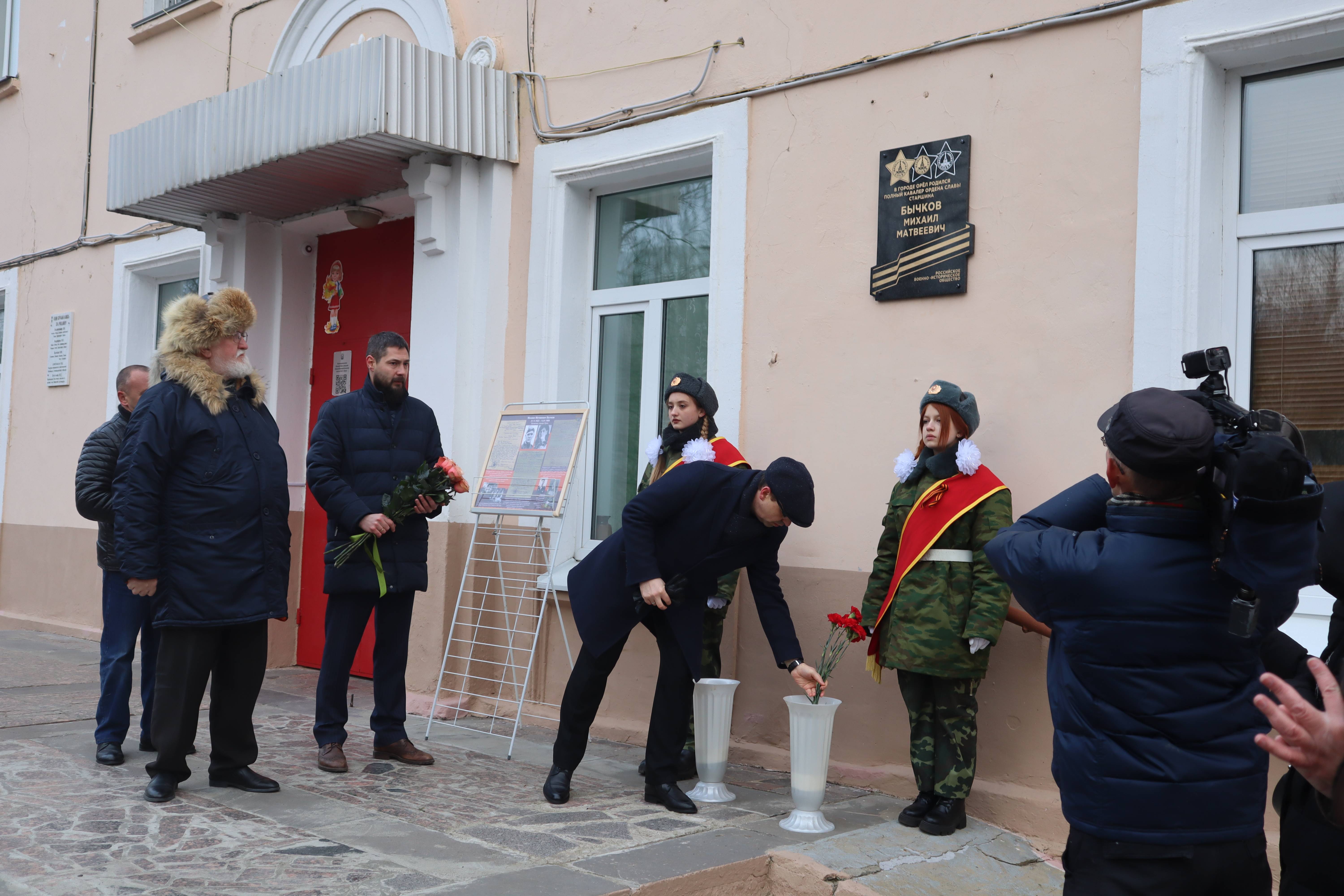 После церемонии открытия памятной доски на воинском кладбище сотрудниками школы и представителями регионального отделения Российского военно-исторического общества к могиле Михаила Матвеевича Бычкова была возложена корзина цветов.