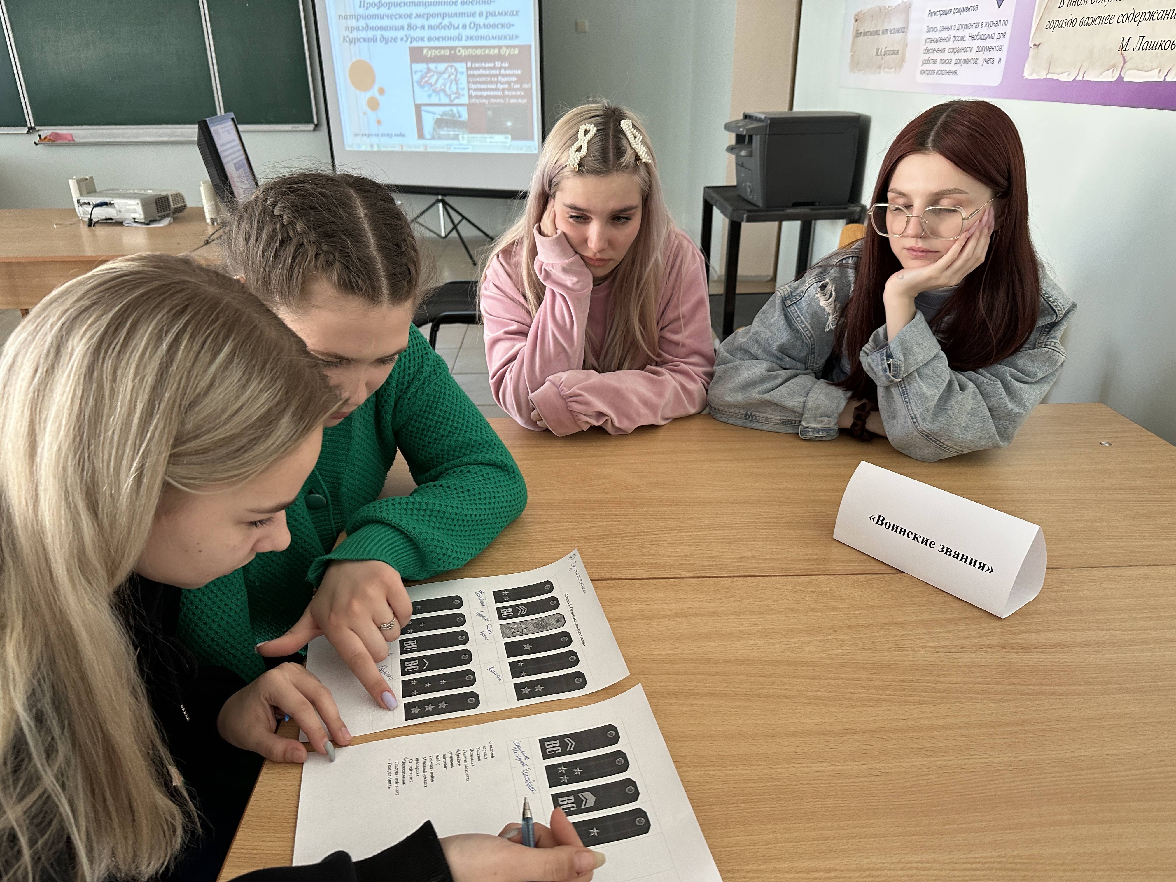 Урок военной экономики прошел в формате викторины, состоящей из четырёх туров: «Воинские звания», «Медсанчасть», «Анаграмма», «Военные ребусы».