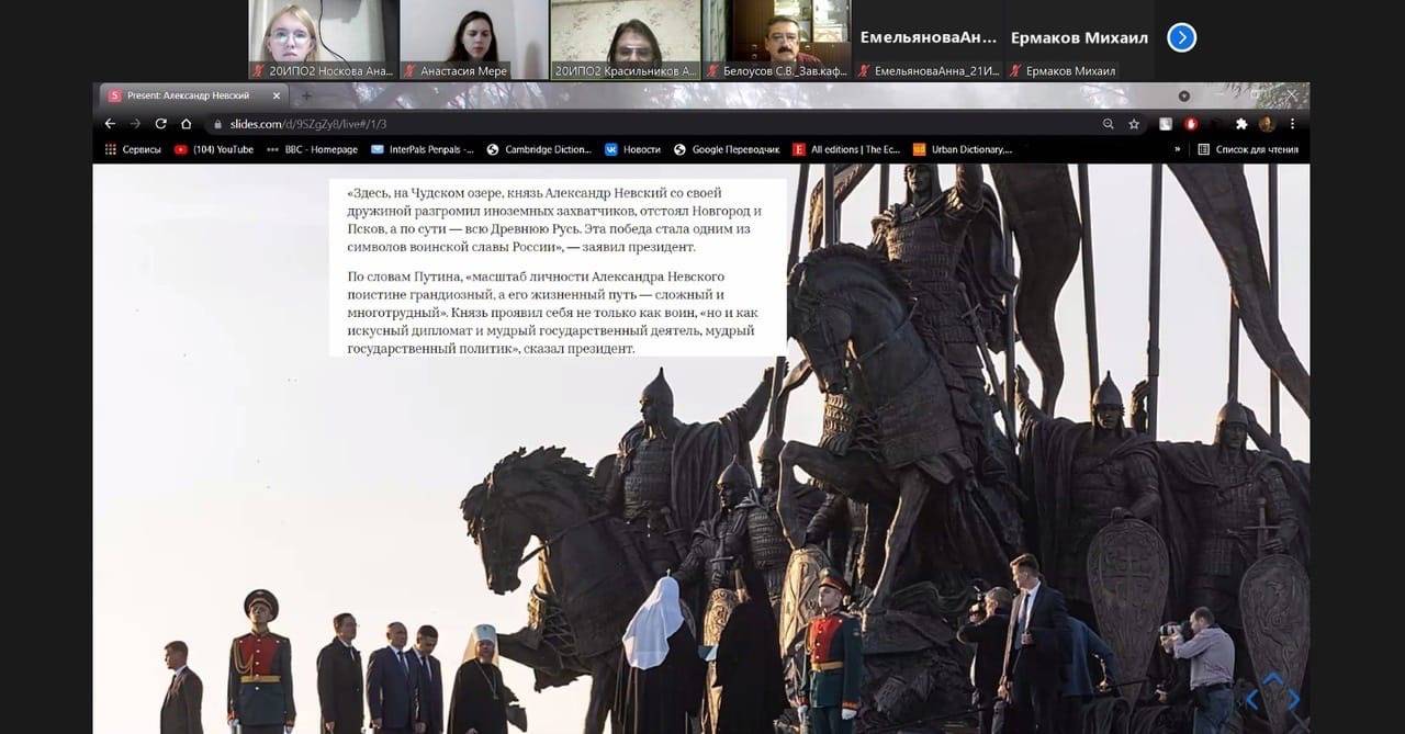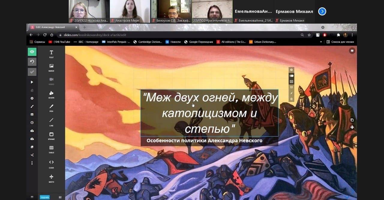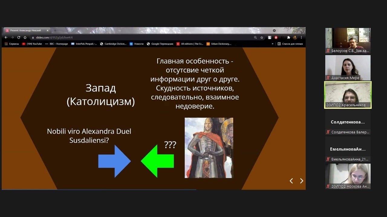 Доклад «”Меж двух огней, между католицизмом и степью”: особенности политики Александра Невского» был представлен студентом гр. 20ИПО2 Андреем Красильниковым. В своем сообщении выступающий проанализировал особенности политического взаимодействия Александра Невского с Западной Европой и Ордой, выделил общие и особенные методы, характерные для этого взаимодействия. Сделан вывод о неоднозначности общепринятых оценок деятельности князя Александра Ярославича.