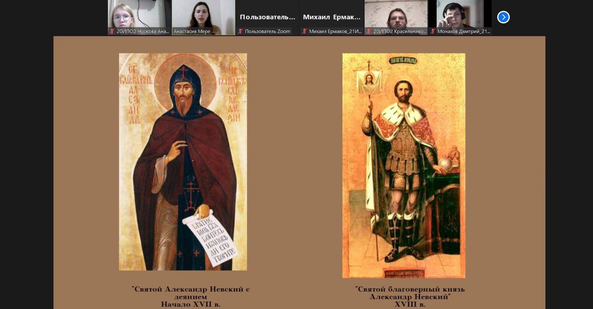 С сообщением «"Не в силе Бог, но в правде!": религиозный аспект осмысления деятельности Александра Невского как фактор мифологизации» выступила студентка гр. 21ЗИПОм1 Анастасия Мере. В своем докладе Анастасия осветила основные этапы трансформации образа князя Александра Ярославича в исторической науке, а также проанализировала влияние канонизации на репрезентацию этого образа в исторических источниках и массовом сознании.