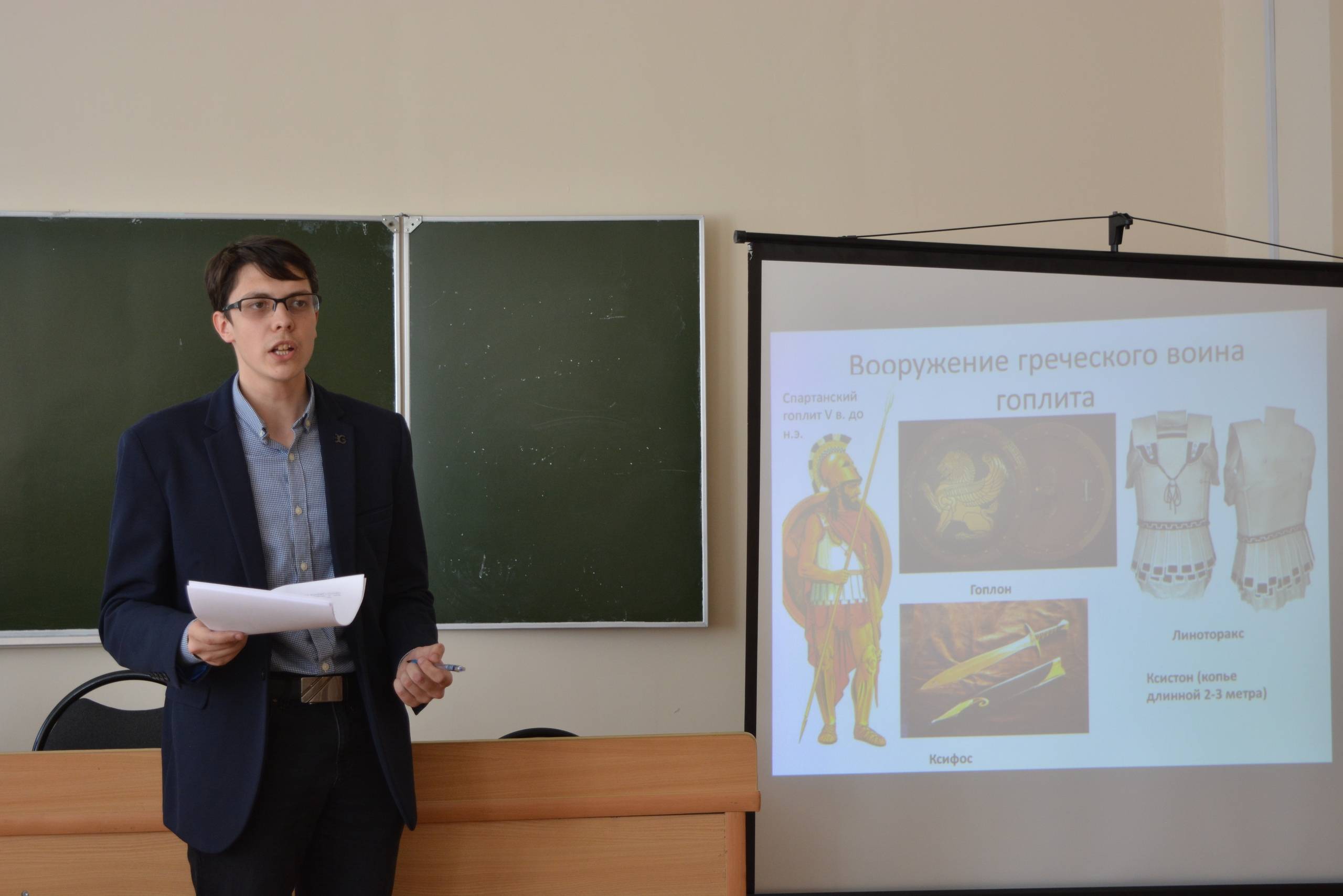 Вторым с докладом «Боевые построения войск в эпоху классической и эллинистической Греции» выступил студент гр. 21ИПО1 Дмитрий Монахов, акцентировавший внимание на эволюции фаланги как боевого порядка.