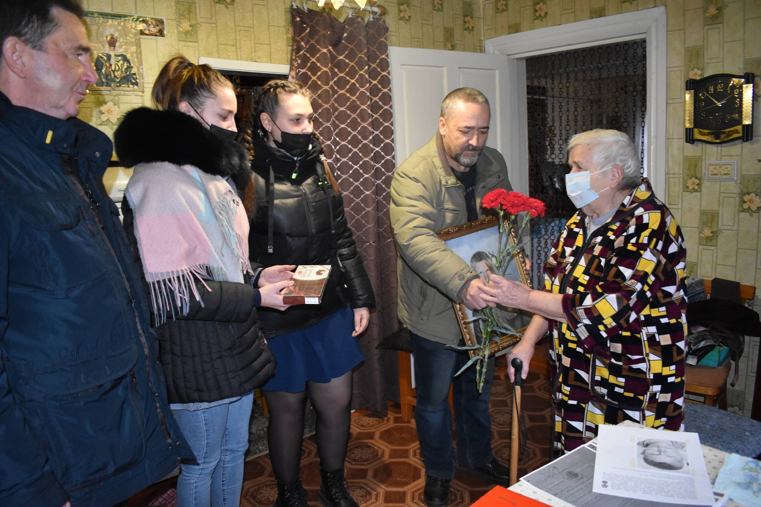 Волонтеры поздравили Раису Даниловну с праздником и вручили ей портрет отца, написанный специально к этому дню каменским художником Юрием Шиманским.