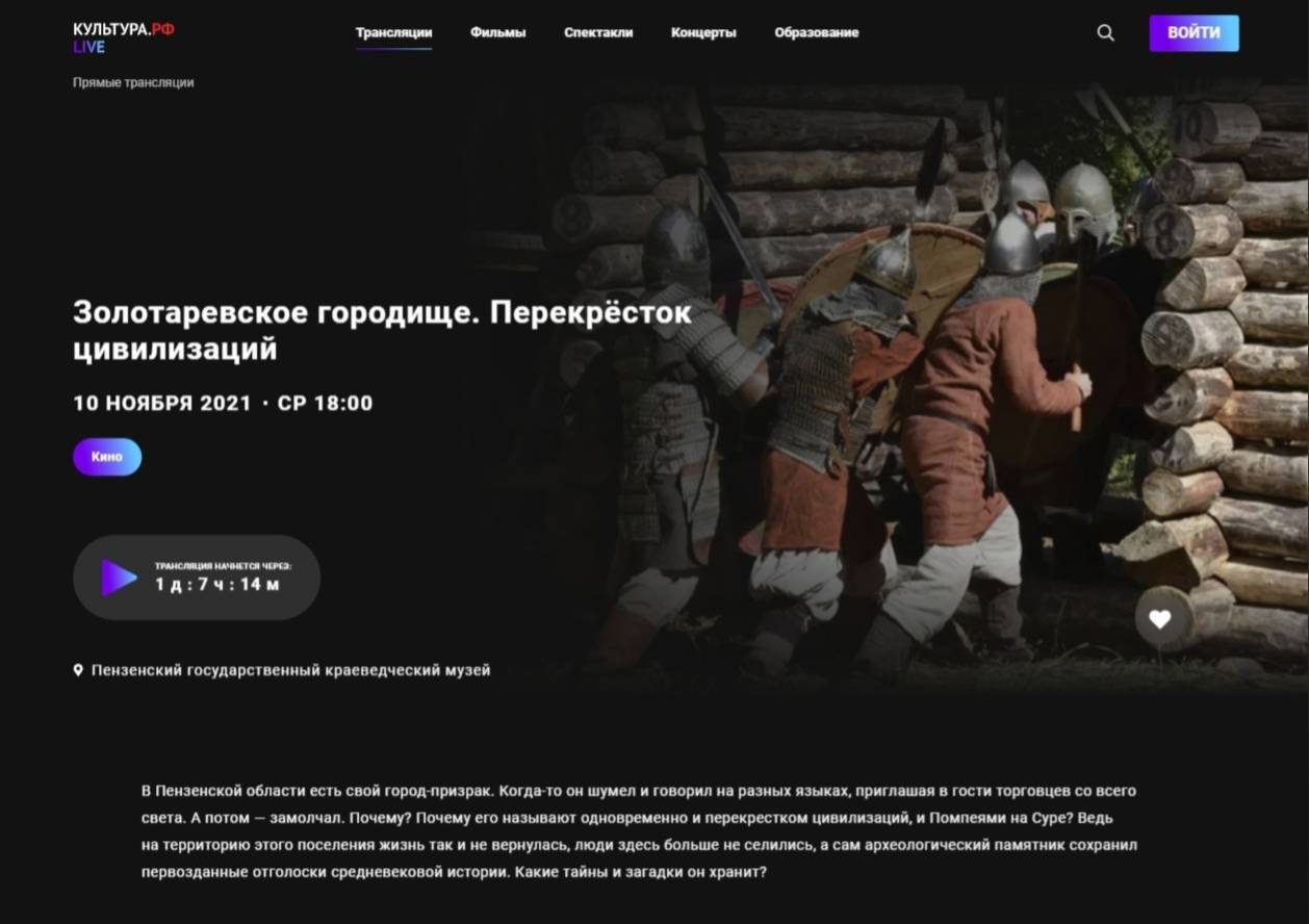 Смотреть: https://www.culture.ru/live/broadcast/20849/zolotarevskoe-gorodishe-perekryostok-civilizacii