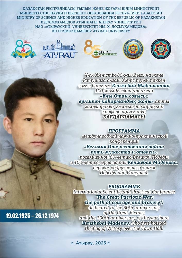 19 февраля 2025 года в Атырауском университете имени Х. Досмухамедова (г. Атырау, Казахстан) состоялась международная научно-практическая конференция ««Великая Отечественная война: путь мужества и отваги», посвященная 80-летию Великой Победы и 100-летию героя войны Кенжебая Маденова, первым водрузившего знамя Победы на Берлинской Ратуше в 1945 году». Организатором конференции является Министерство науки и высшего образования республики Казахстан и Атырауский университет имени Х. Досмухамедова.