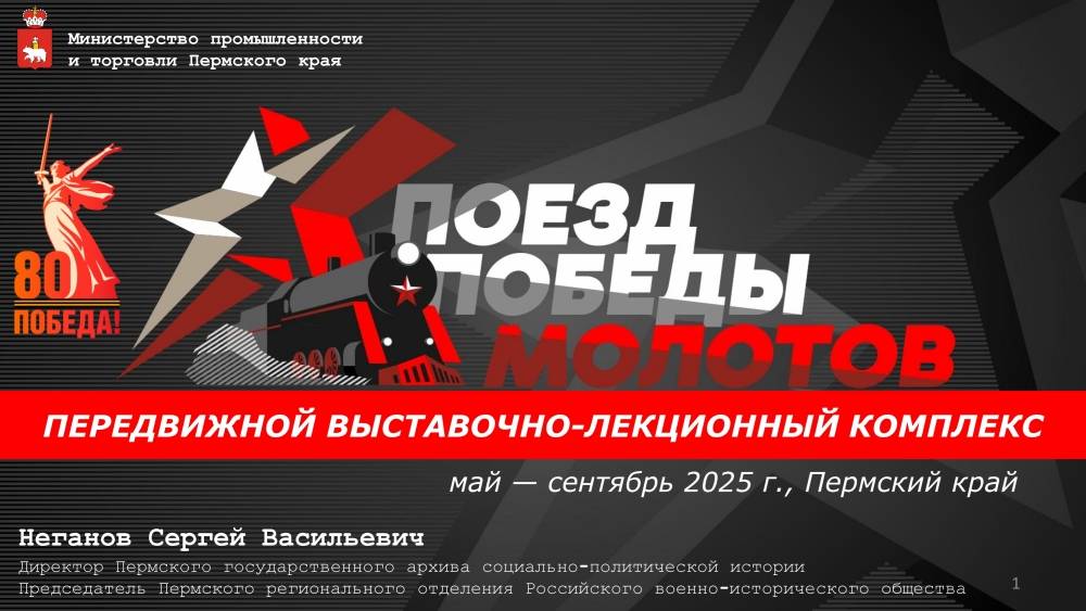 22 апреля 2025 года на заседании краевого оргкомитета «Победа», проходившего под председательством губернатора Пермского края Д.Н. Махонина, с докладом ««Поезд Победы «Молотов». Передвижной выставочно-лекционный комплекс» выступил председатель Пермского регионального отделения Российского Военно-Исторического Общества, директор Пермского государственного архива социально-политической истории С.В. Неганов.