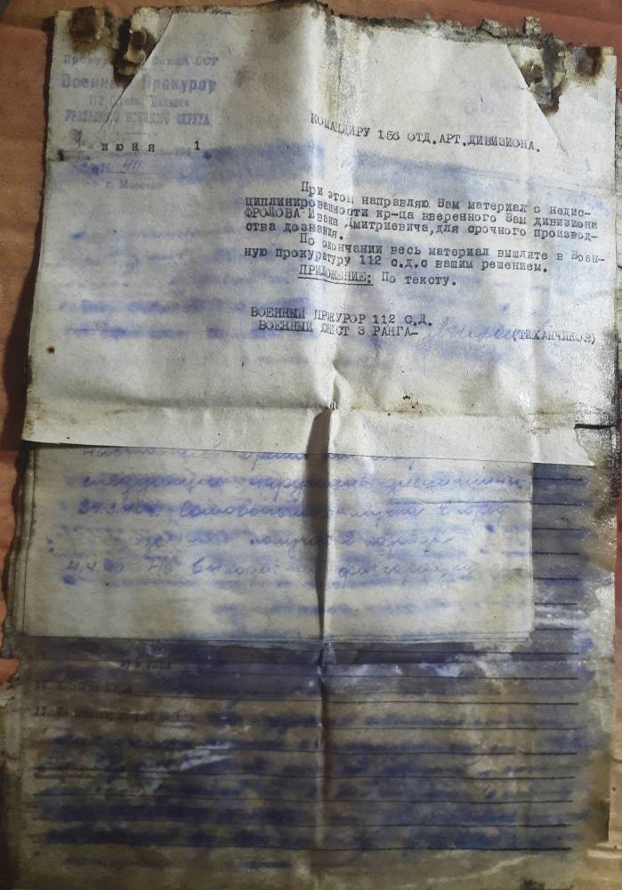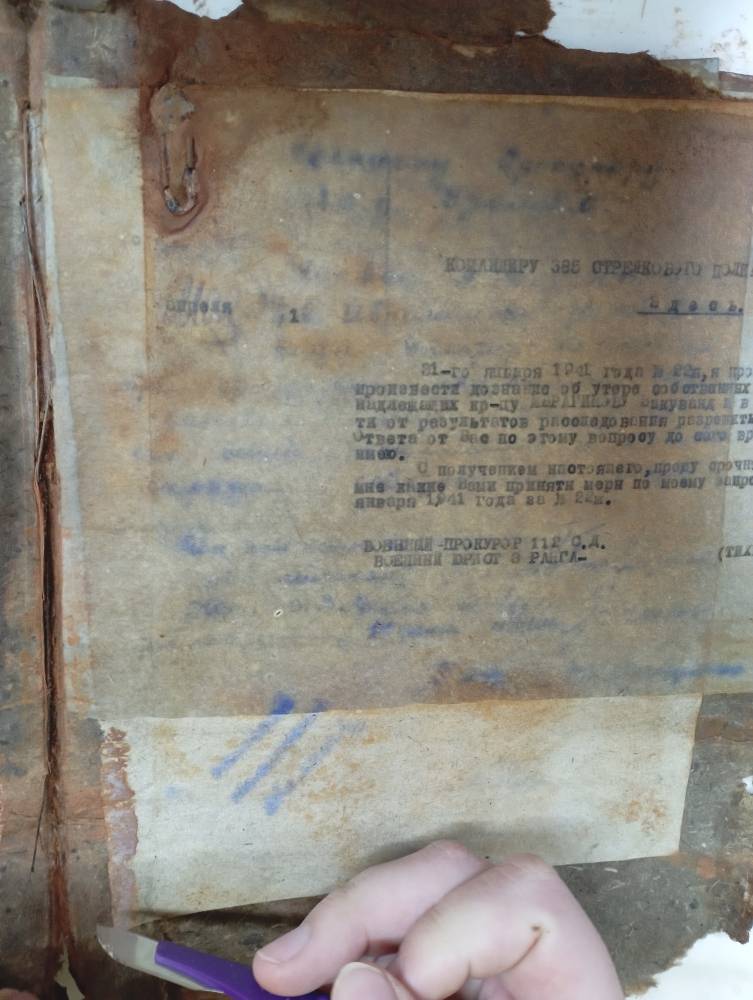 При окружении документы юридической службы сотрудниками военной прокуратуры были спрятаны. Закопанные в железном сейфе бумаги, были обнаружен спустя 83 года в декабре 2024 года во время проведения поисковых работ военно-историческим клубом «Моторы Победы» из города Невель.