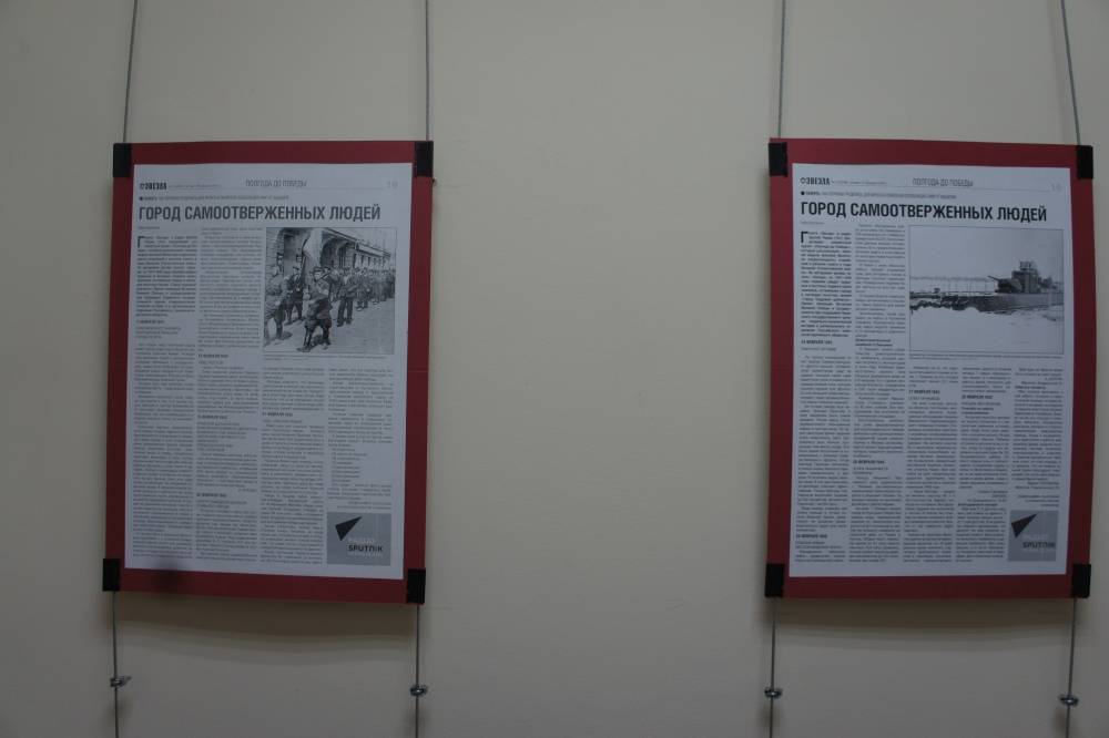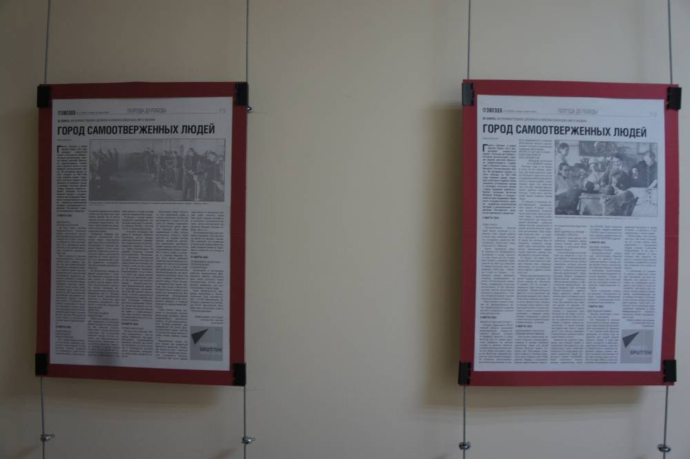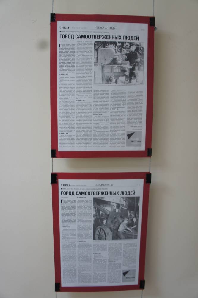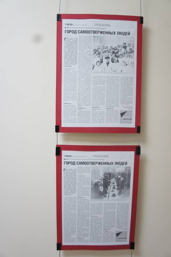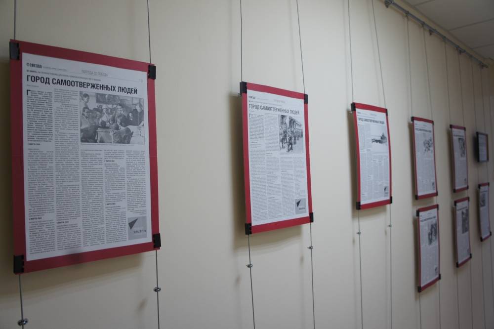 На выставке представлены страницы газеты «Звезда» с еженедельной рубрикой газеты «Полгода до Победы».