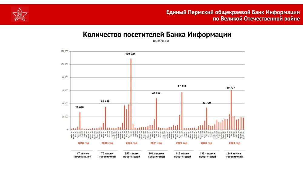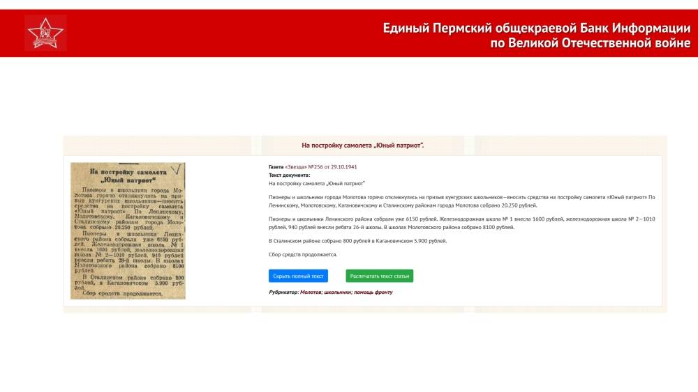 За без малого 5 лет на открытой общедоступной платформе Банка Информации были размещены 27 баз данных общим объемом 449 155 персональных справок и 15 порталов общим объемом 27 781 страница информации. Среди них можно назвать уникальную Базу данных «Жители Пермского края, участвовавшие в Великой Отечественной войне», которая создана на основе переданных в ПермГАСПИ в 2020 году из всех военных комиссариатов Пермского края документов периода Великой Отечественной войны; наполненную за эти годы новым уникальным содержанием Базу данных «Военнопленные. База данных военнослужащих, призванных из Молотовской области (Пермского края) попавших в плен в ходе Великой Отечественной войны», созданную на основе документов органов военной контрразведки «Смерш» и трофейных немецких документов, переданных в ПермГАСПИ из Управления ФСБ России по Пермскому краю; новый открытый в этом году ресурс – База данных ««Звезда». Полная подборка номеров Молотовской областной газеты «Звезда» за 1941–1945 гг. с возможностью контент-поиска»; всеобъемлющий портал «Энциклопедия «Пермский край в Великой Отечественной войне. 1941–1945 гг.»»; всеобъемлющий портал «Пермский край – край трудовой доблести», содержащий Базу данных лучших рабочих пермских оборонных заводов в годы войны, детальную карту пермских промышленных предприятий того времени, и многое-многое другое.