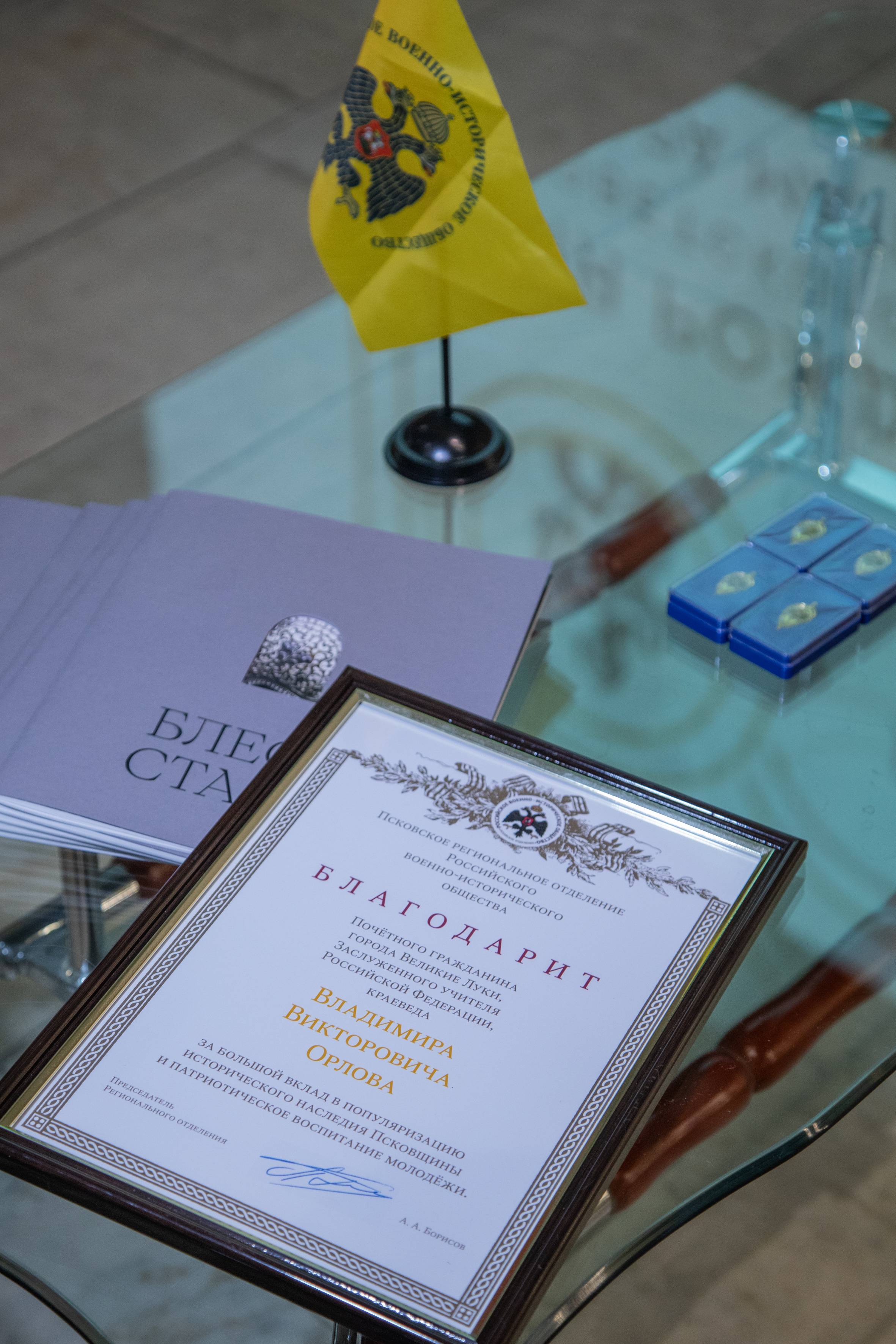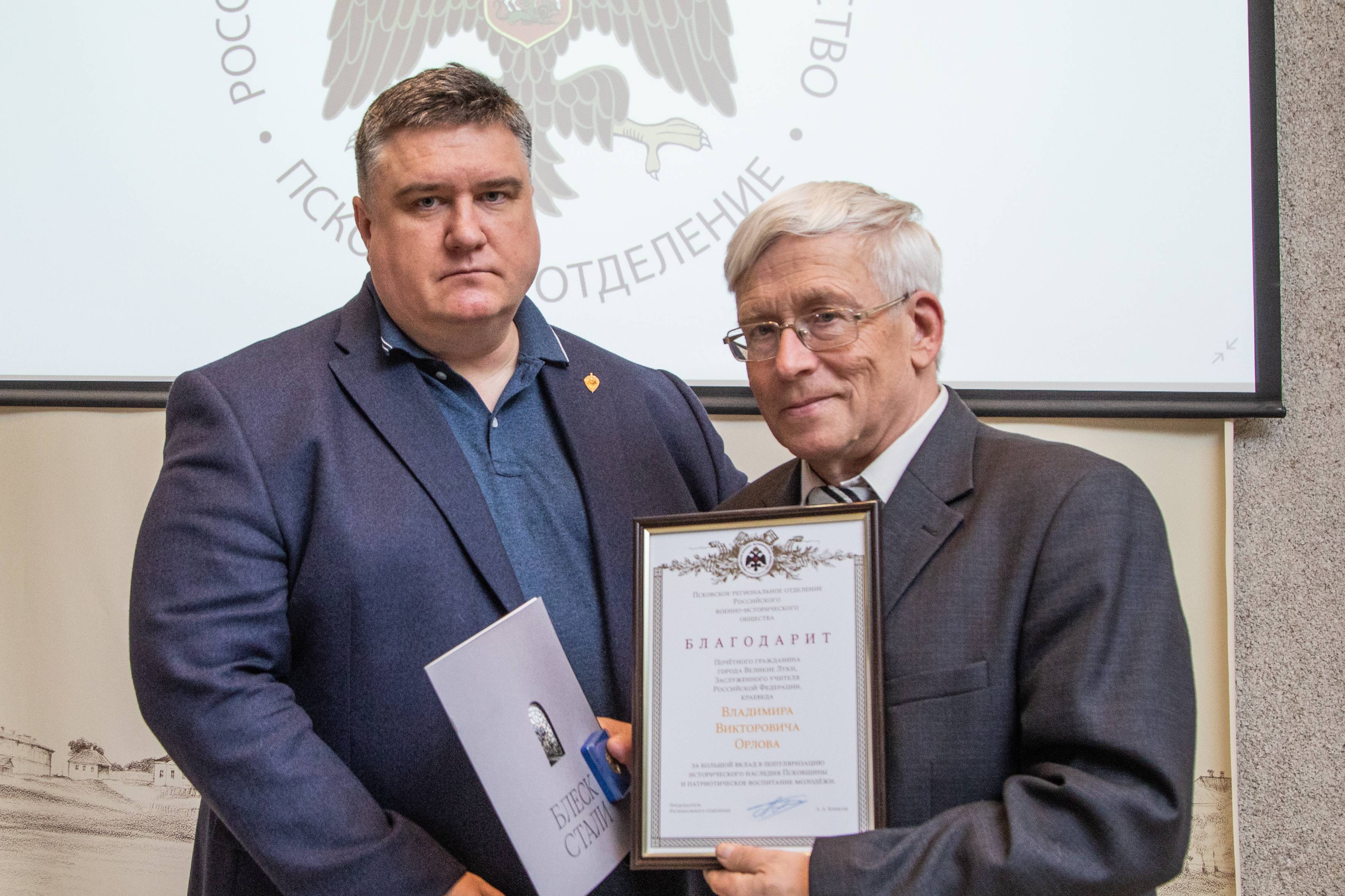 Также почетную грамоту и значок вручили Почетному гражданину города Великие Луки, заслуженному учителю РФ, краеведу Владимиру Орлову.