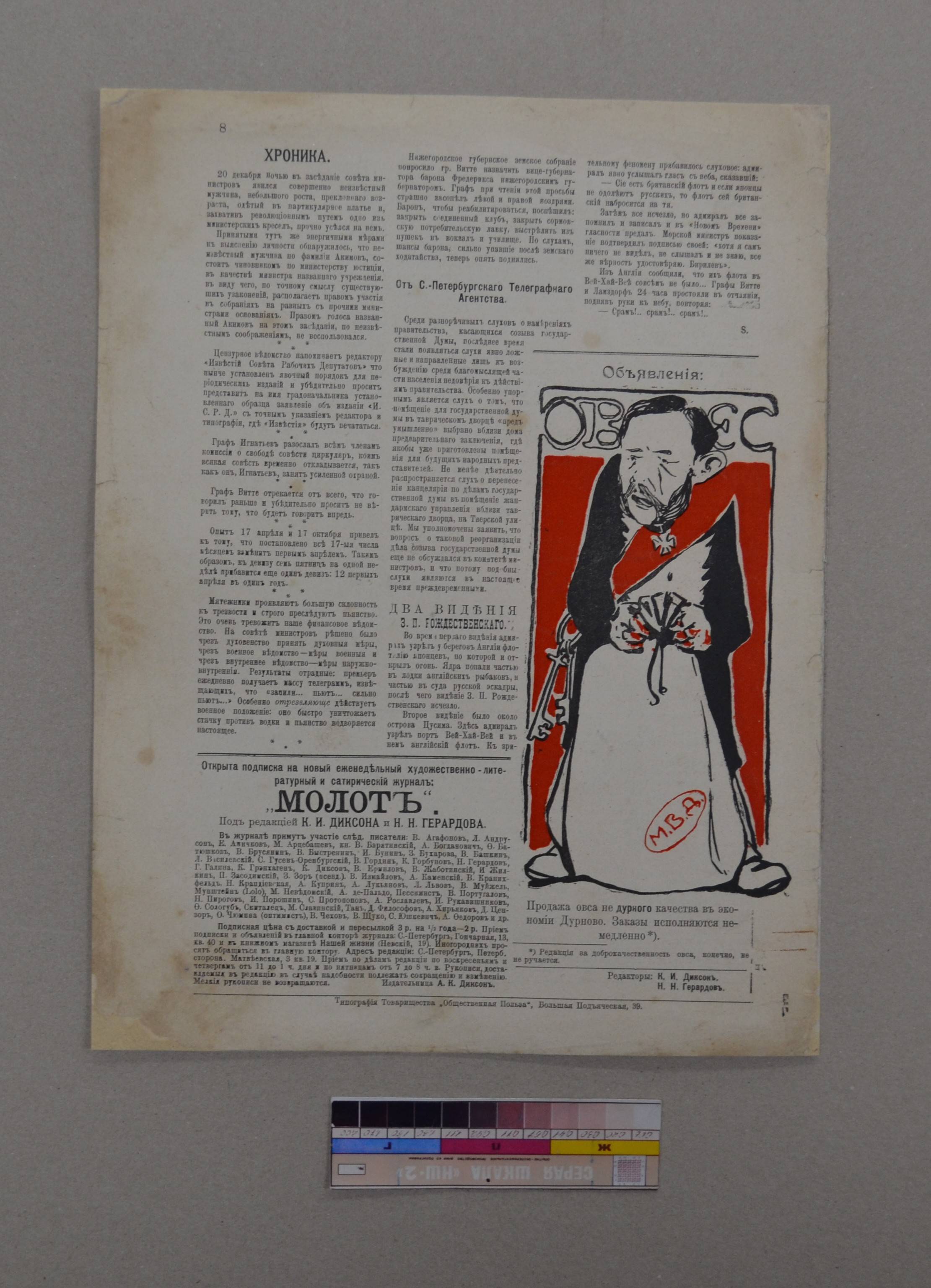 В центре консервации библиотечного фонда Донской государственной публичной библиотеки завершилась работа по реставрации журнала «Молот» за 1906 год, входящего в коллекцию «Сатирические журналы 1905-1907 гг.» из фонда библиотеки (доступны в Донской электронной библиотеке ДЭБ).