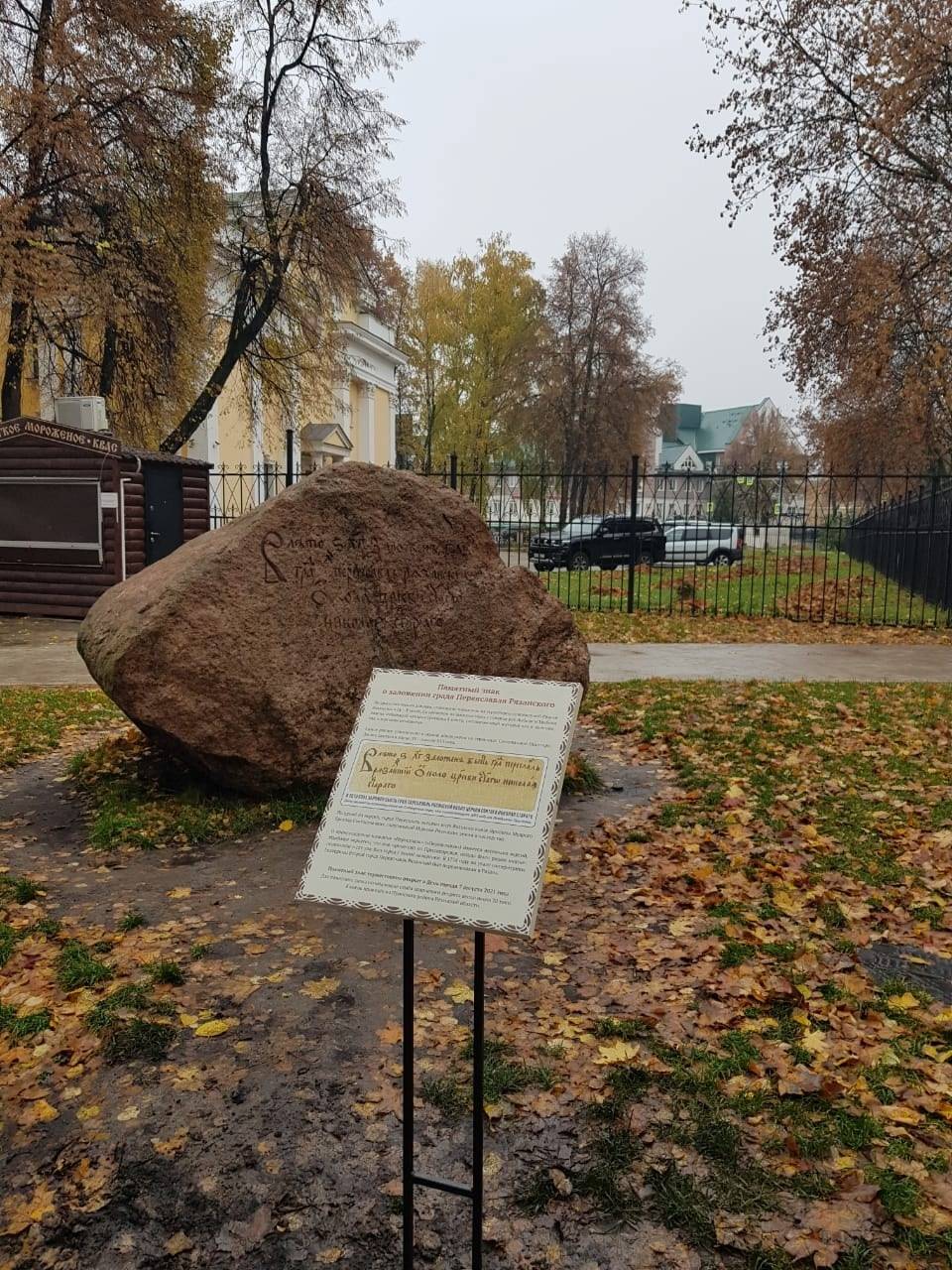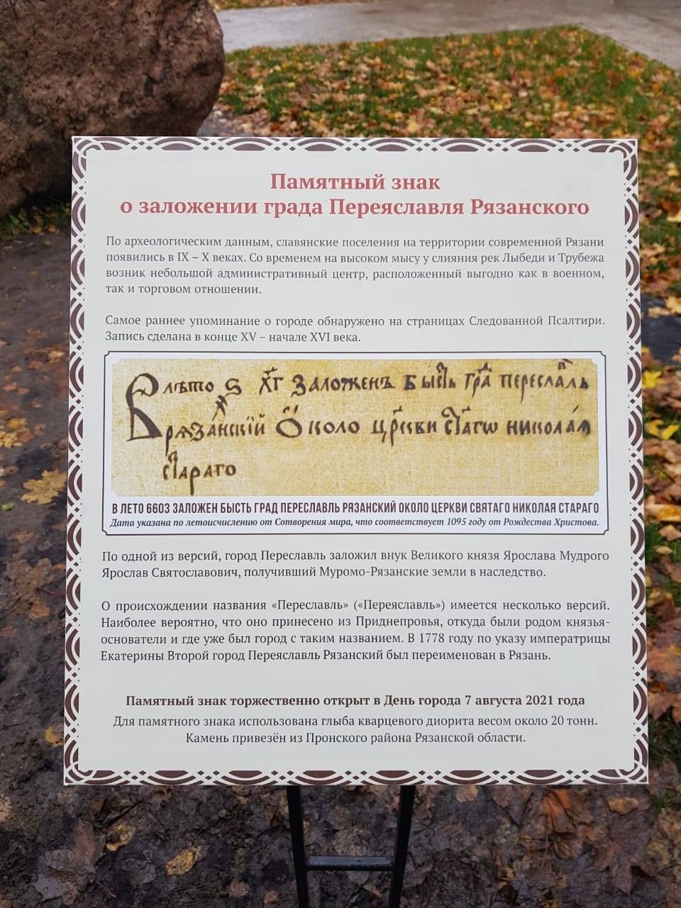 На камне высечена цитата из Следованной Псалтири конца 16 века: «В лето 6603 (1095) заложен бысть град Переяславль Рязаньской около церкви святого Николы Старого».