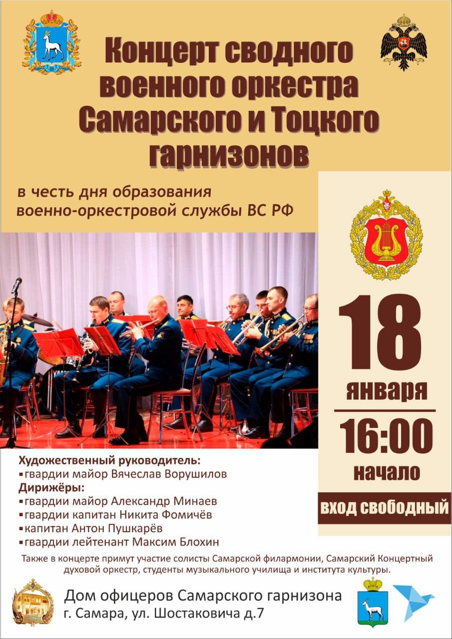 18 января 2023 года в 16.00 по адресу г. Самара, ул. Шостаковича, д. 7 (Дом офицеров Самарского гарнизона) состоится патриотический концерт большого сводного военного оркестра Самарского и Тоцкого гарнизонов с участием лучших музыкантов и солистов Самарской государственной филармонии, Концертного духового оркестра, студентов музыкального училища и Самарского государственного института культуры. Программа подготовлена к Дню образования военно-оркестровой службы Вооружённых Сил Российской Федерации и включает в себя известные и любимые произведения, а также уникальные музыкальные премьеры.
