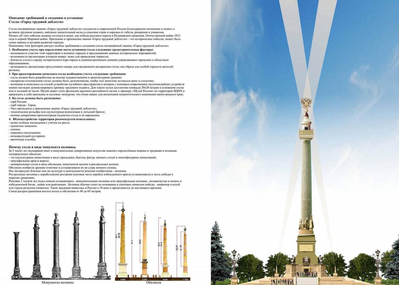 Всероссийский творческий конкурс на архитектурно-художественное решение монументов «Город трудовой доблести» проводился Российским военно- историческим обществом в рамках национального проекта «Культура». Всего на конкурс было представлено 20 работ. Проекты обязательно должны были содержать изображения герба города и текста указа Президента РФ о присвоении звания.
