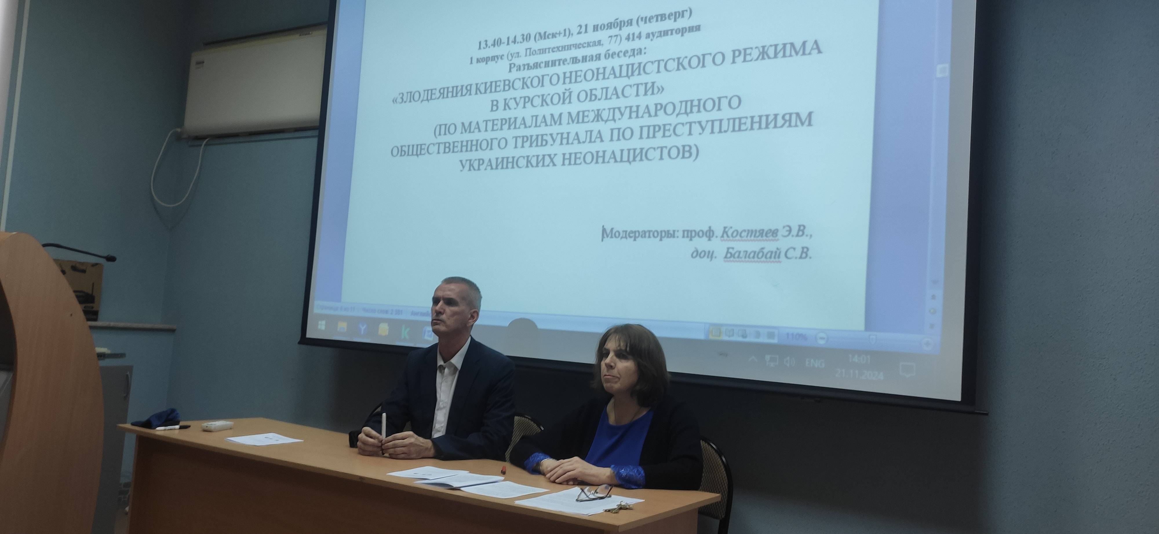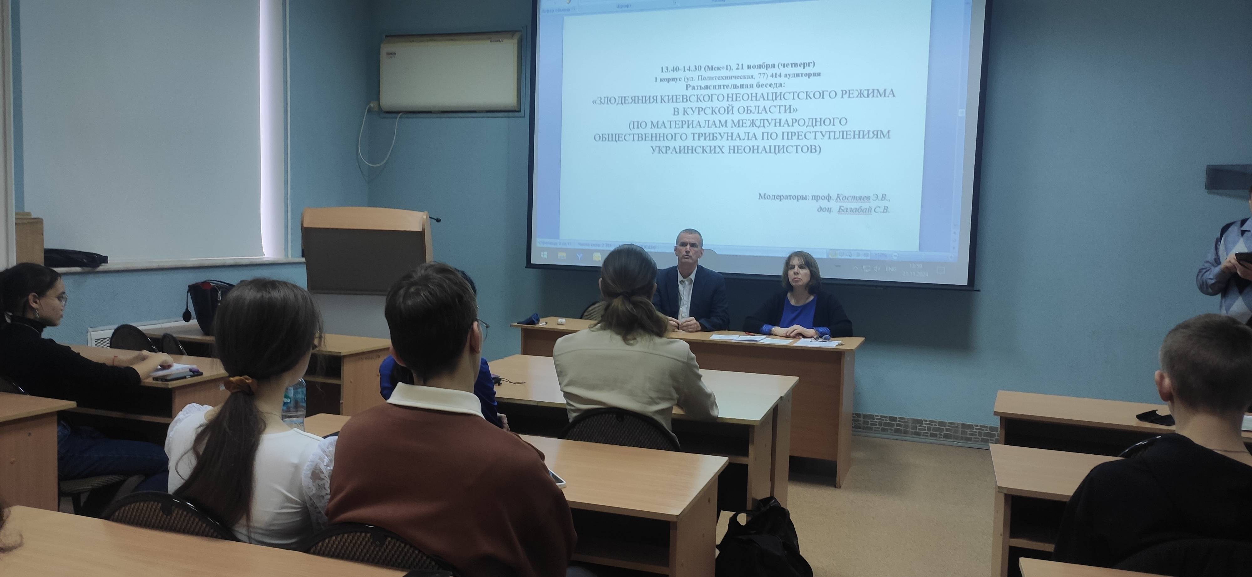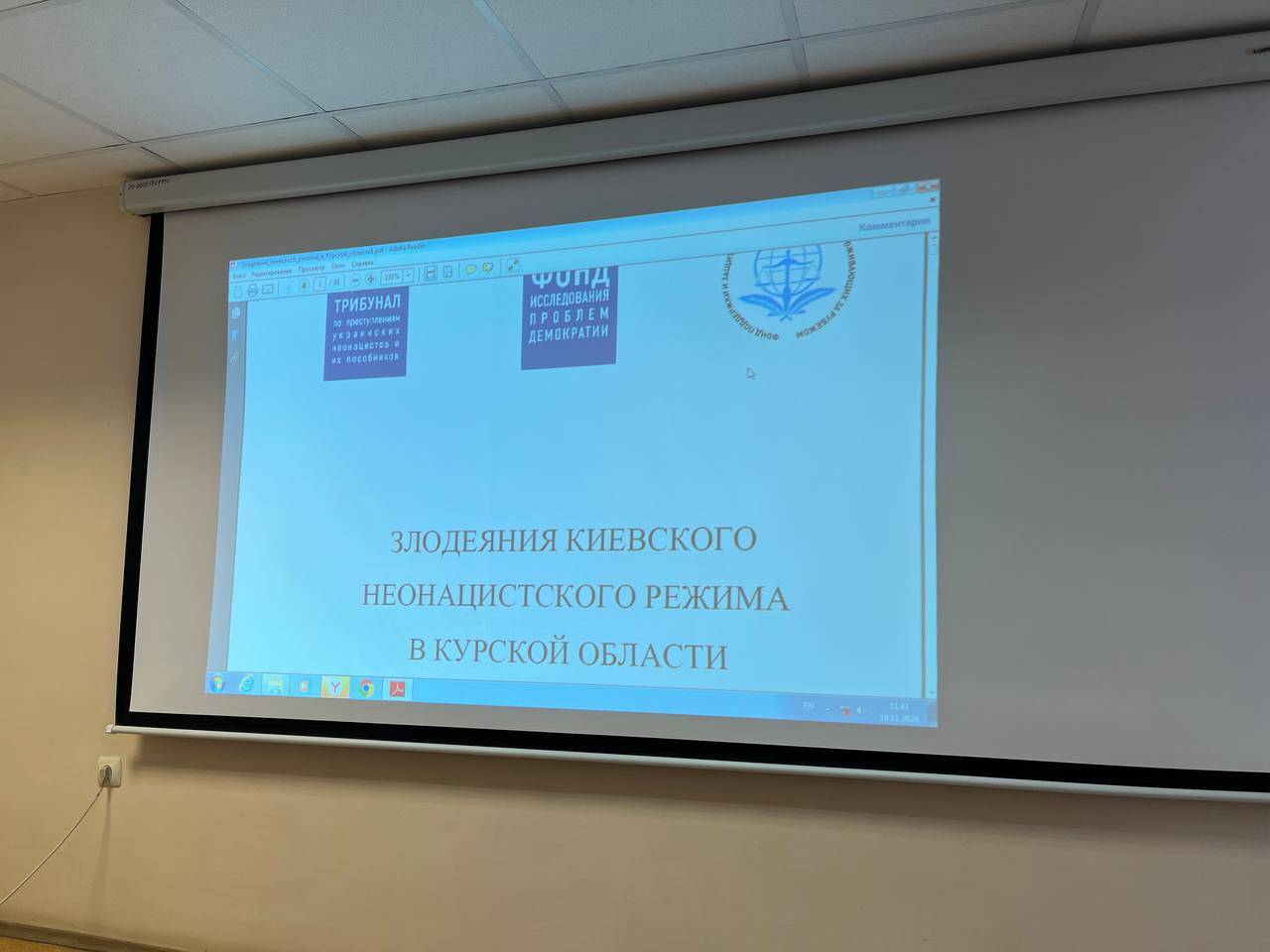 21 – 22 ноября 2024 года в рамках Всероссийской научной конференции – школы молодых учёных «Гуманитарный мир: человек, общество, история» с участниками конференции провели разъяснительную беседу «ЗЛОДЕЯНИЯ КИЕВСКОГО НЕОНАЦИСТСКОГО РЕЖИМА В КУРСКОЙ ОБЛАСТИ», которая была подготовлена по материалам Международного общественного Трибунала по преступлениям украинских неонацистов.