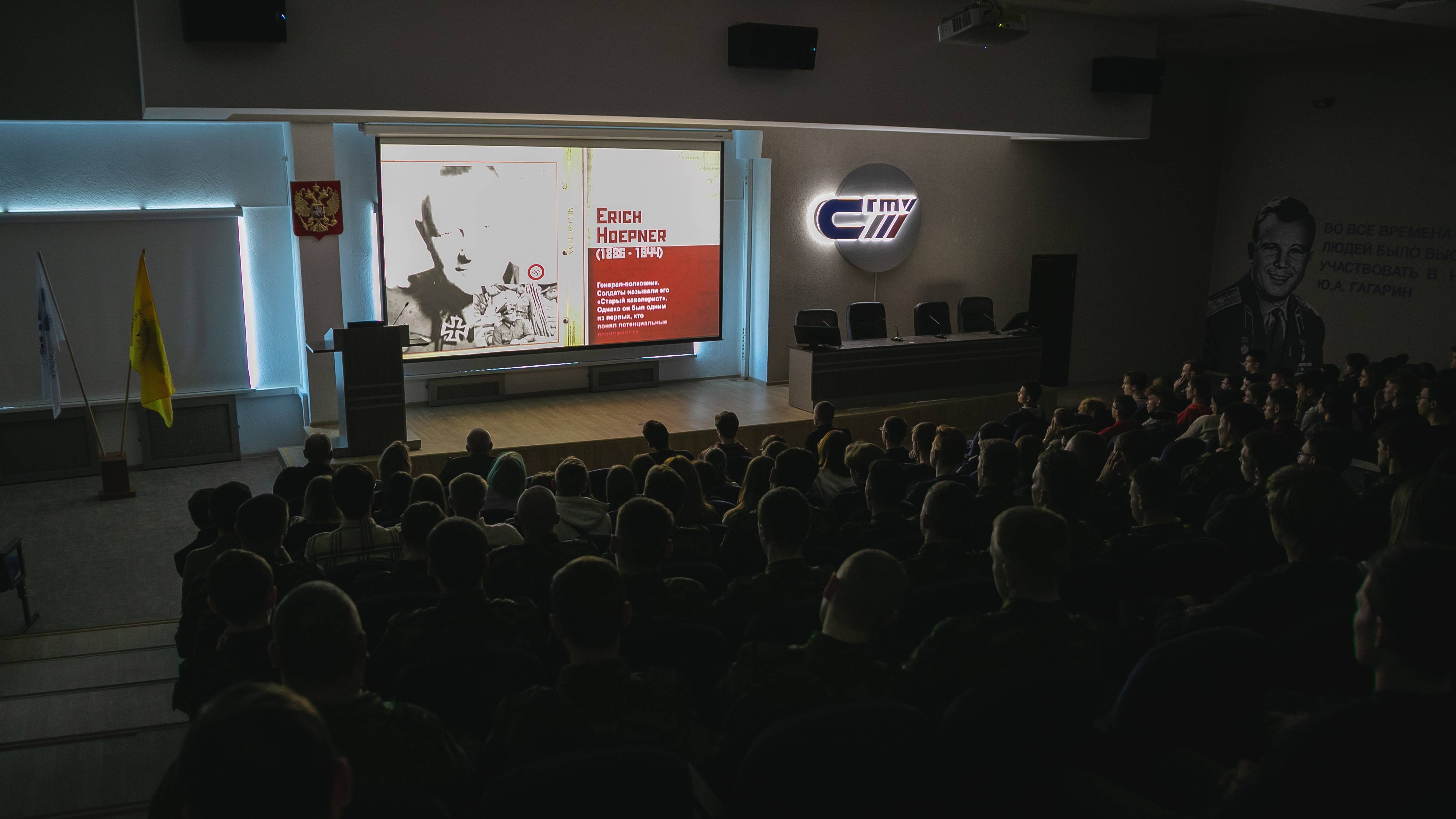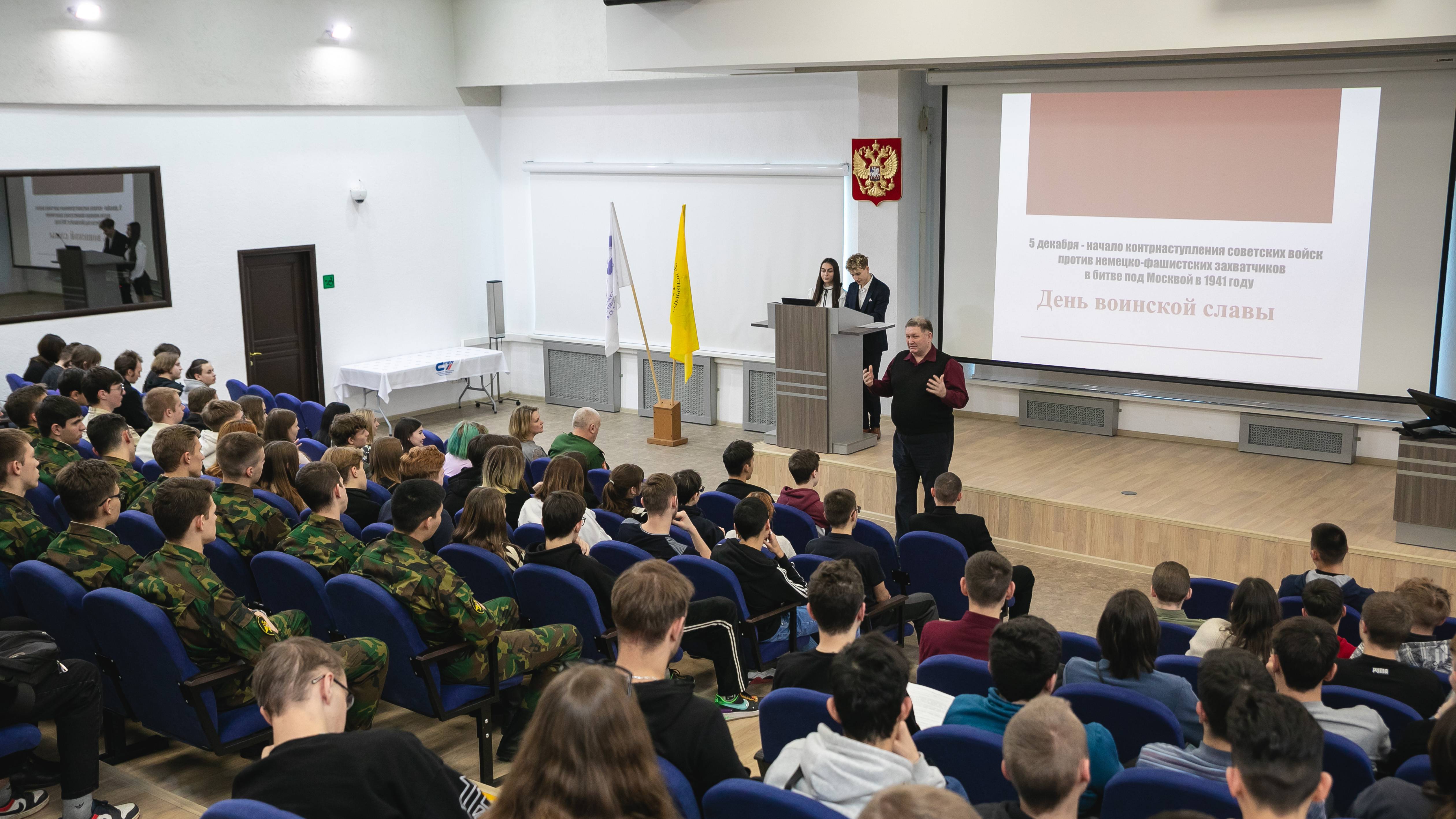Молодой аудитории рассказали о сражении под Москвой в 1941 – 1942 гг., нанесшем первое крупнейшее поражение фашистской Германии, раскрыли значение контрнаступления для дальнейшего хода войны. Студенты услышали о подвигах земляков-саратовцев, которые принимали участие в битве: Иване Васильевиче Панфилове, Василии Георгиевиче Клочкове. Также состоялся показ и обсуждение документального фильма «Битва за Москву» из цикла «Великая война».