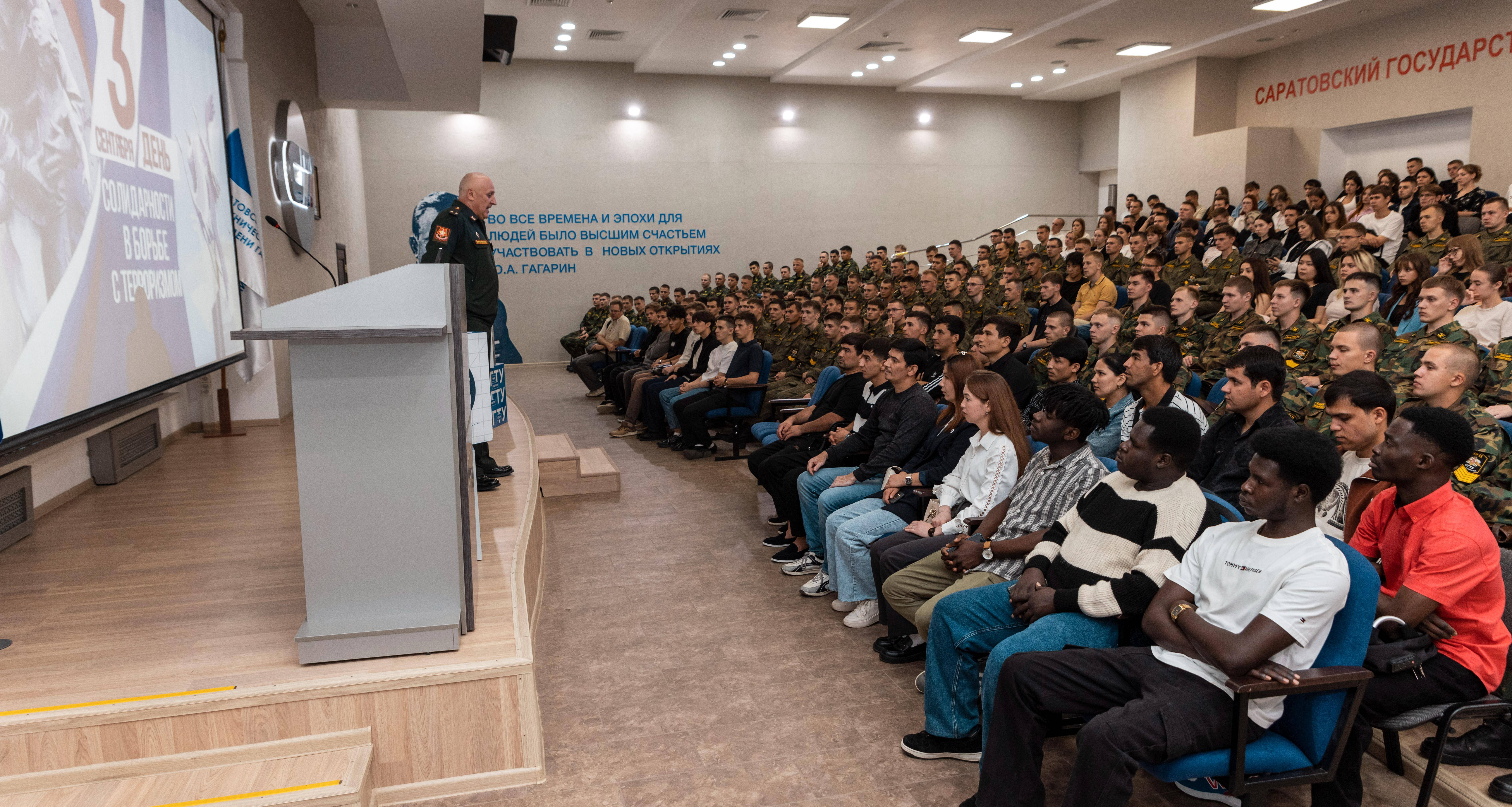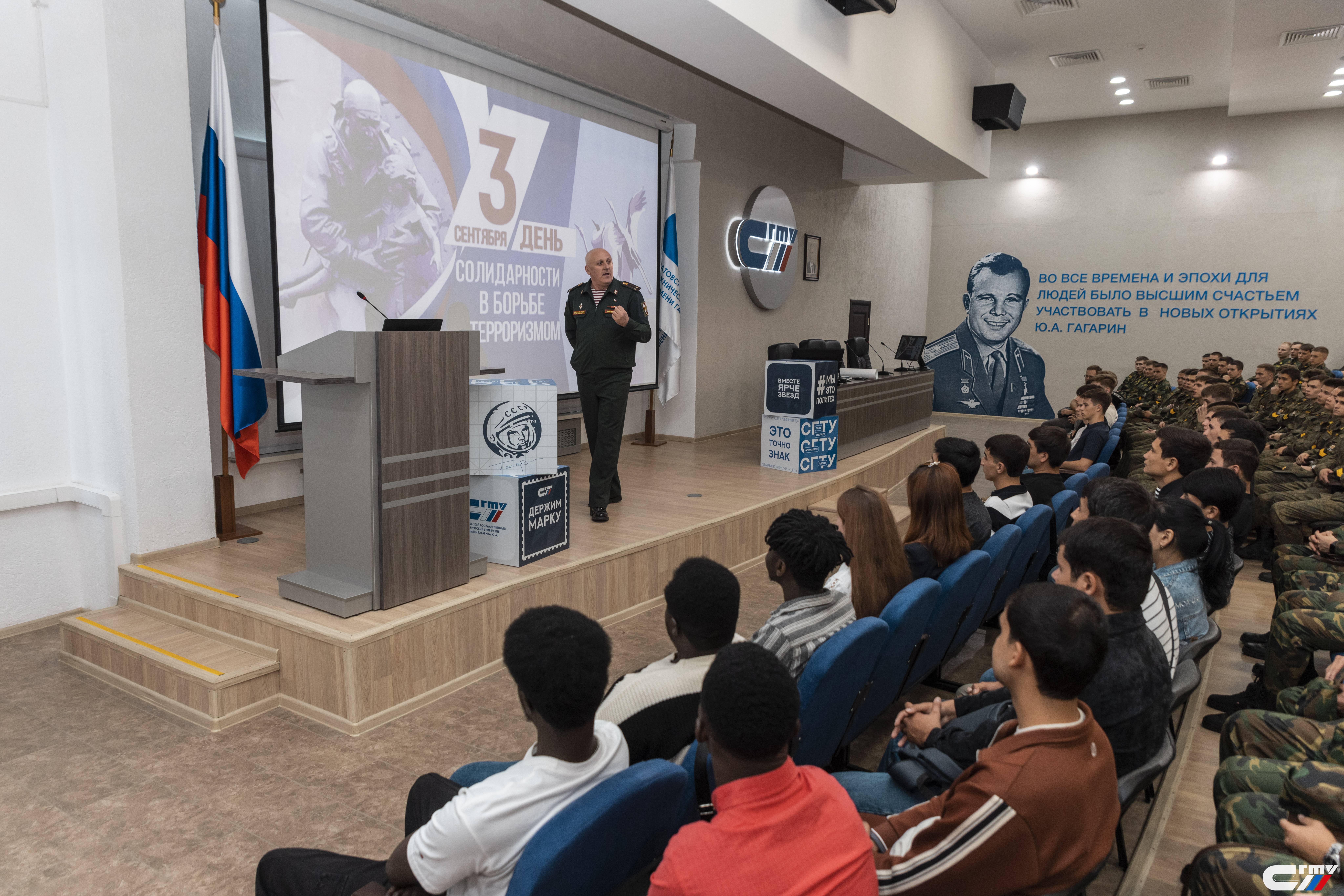 Сегодня, вспоминая жертв Беслана и Буденновска, захвата театрального центра на Дубровке и теракта в «Крокус Сити Холле», при взрывах жилых домов в Москве, Буйнакске и Волгодонске, и всех террористических актов, а также сотрудников правоохранительных органов, погибших при выполнении служебного долга, в СГТУ имени Гагарина Ю.А. активисты Саратовского регионального отделения «Российского военно-исторического общества» провели патриотическое мероприятие «Мы против терроризма». Студентам показали документальный фильм от молодежного центра «Лигово». Также участники познакомились с выставкой стендового моделирования «Защитники мирной жизни».