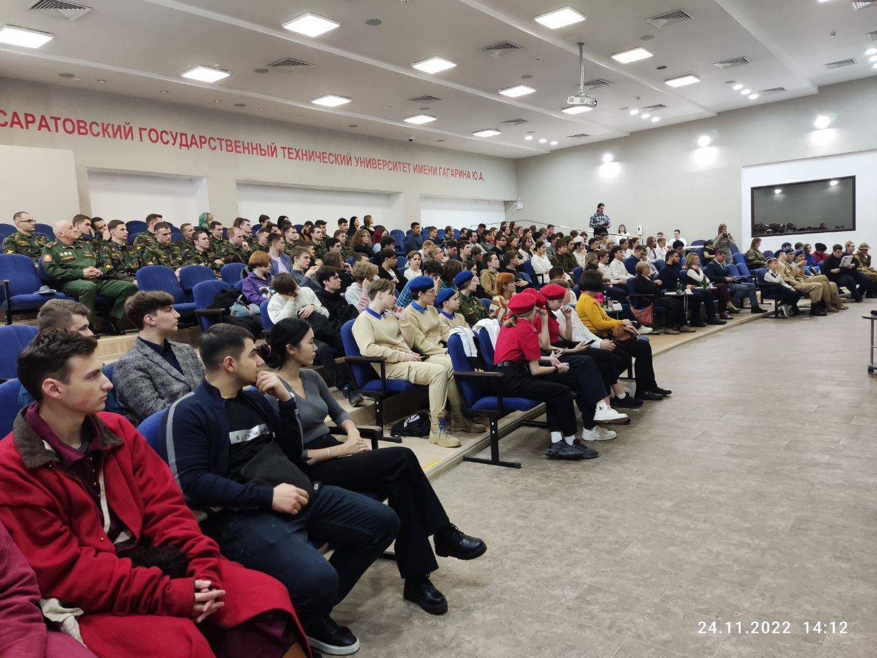 Почетными гостями мероприятия стали член Общественной палаты Саратовской области, журналист, поэт, руководитель «Регионального добровольческого центра «Волонтеры культуры» Всеволод Хаценко, начальник штаба Регионального отделения ВВПОД "ЮНАРМИЯ" по Саратову Андрей Масленников, руководитель центра военно-патриотической деятельности «Созвездие», майор запаса Вячеслав Кочетков, начальник цикла Военного учебного центра СГТУ имени Гагарина Ю.А., подполковник запаса Валерий Алешичев, ветераны боевых действий.