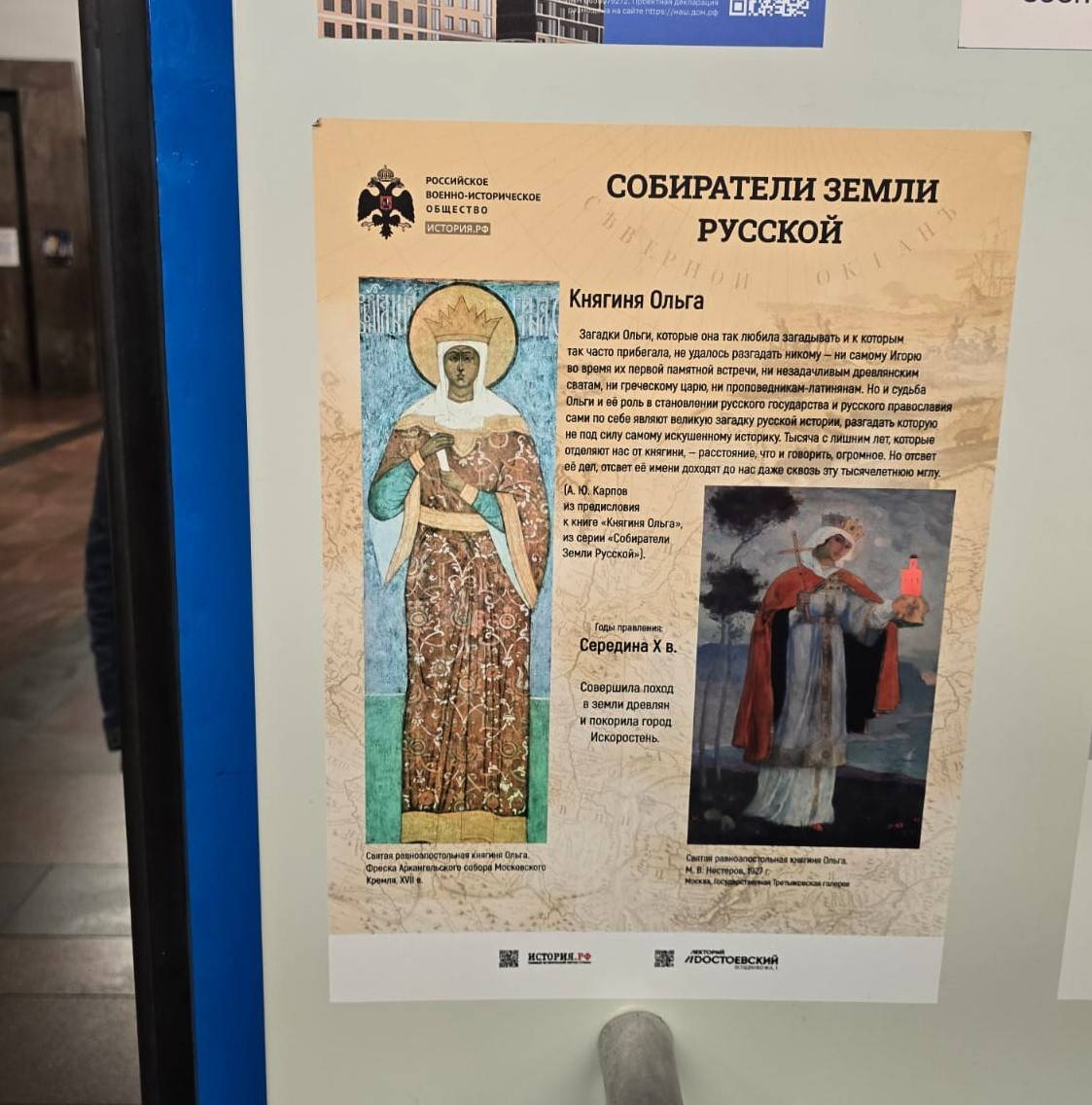 В екатеринбургском метрополитене размещены рекламные плакаты, посвящённые проекту Российского военно-исторического общества (РВИО) «Собиратели Земли Русской». Один из них рассказывает о княгине Ольге — одной из ключевых фигур древнерусской истории, стоявшей у истоков формирования российской государственности.