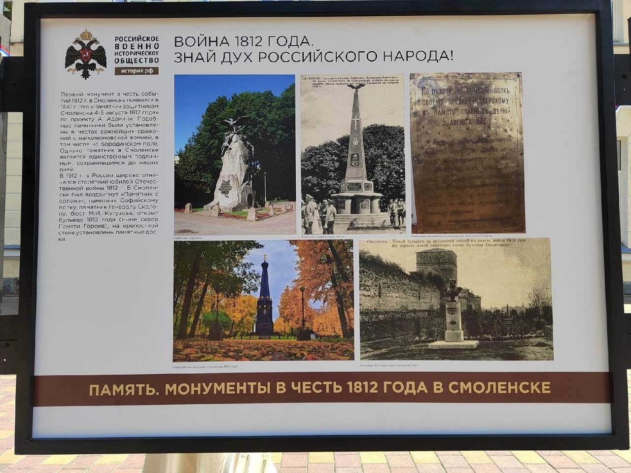 16 августа 2022 года состоялась церемония открытия уличной планшетной выставки «Война 1812 года! Знай дух российского народа», организованной Смоленским региональным отделением Российского военно-исторического общества. Общедоступная экспозиция состоит из 24 выставочных планшетов, расположенных в хронологическом порядке. Представленные материалы позволяют любому посетителю ознакомиться в важными историческими событиями Отечественной войны 1812 года и узнать о роли Смоленского сражения 4-5 августа. Смоленск в очередной раз стал щитом России, непоколебимо встав на пути вражеских полчищ.