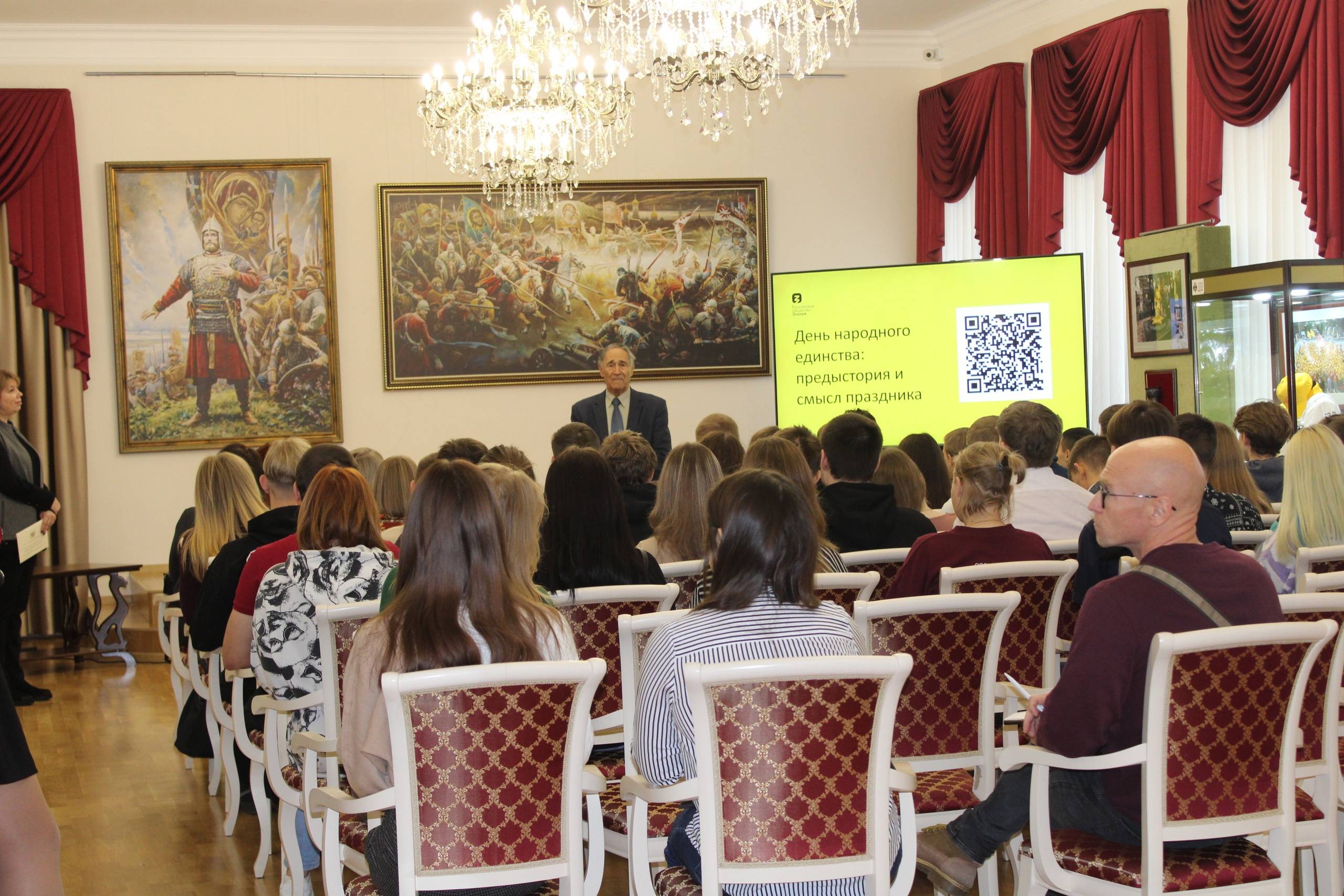 В Музее истории Российского военно-исторического общества, открытом на базе штаб-квартиры регионального отделения РВИО - Музейно-выставочного центра Тамбовской области с открытой лекцией на тему "День народного единства: предыстория и смысл праздника", организованной Российским обществом «Знание», перед студентами технического университета выступил декан Естественнонаучного и гуманитарного факультета ТГТУ, кандидат исторических наук, доцент Самохин Константин Владимирович.
