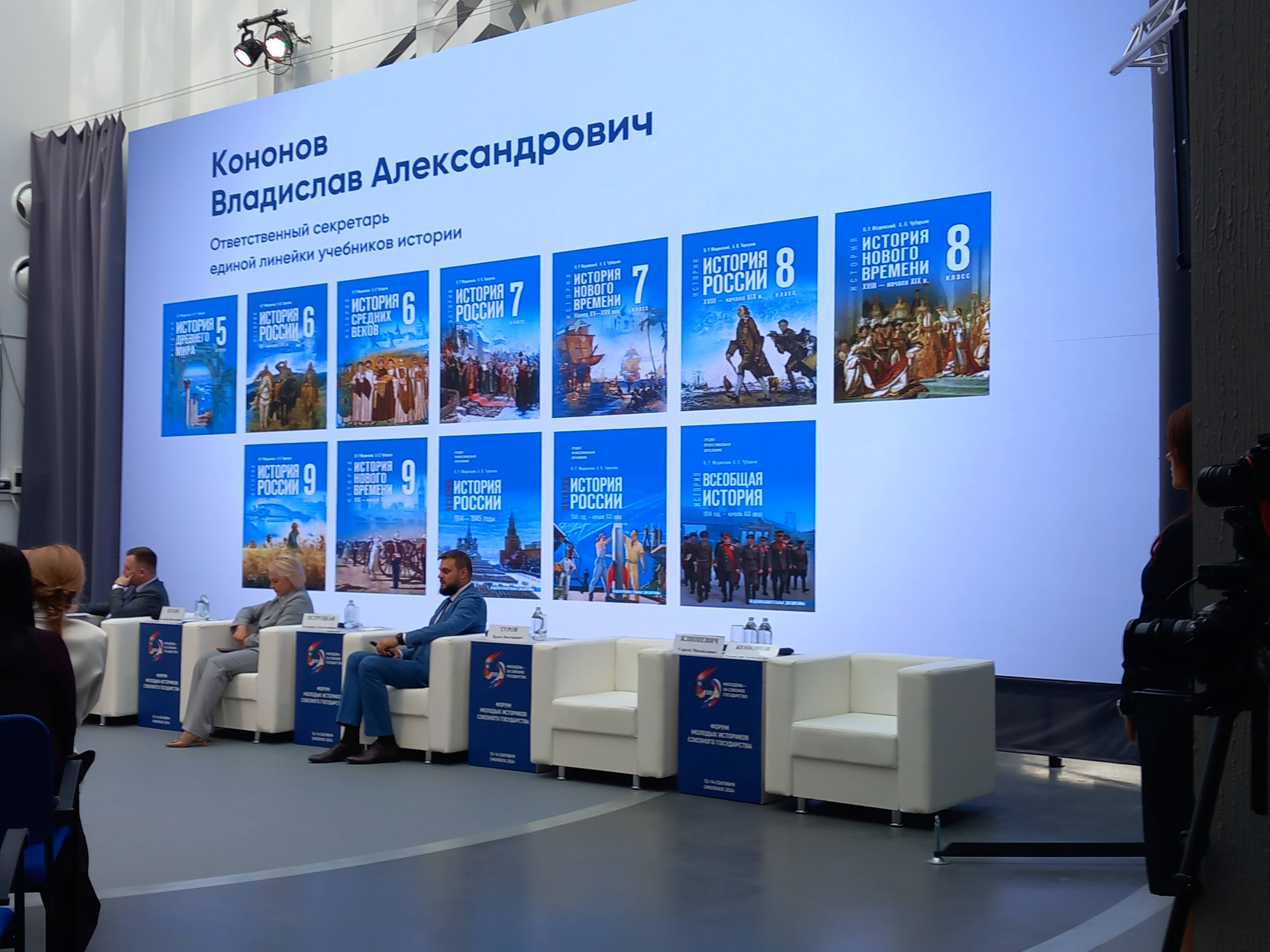 На секции «Создание единого учебника истории в Республике Беларусь и Российской Федерации. Значение события для государственной политики Белоруссии и России, Союзного государства в целом» Референт Управления Президента РФ по государственной политике в гуманитарной сфере Владислав Кононов и Научный директор Российского военно-исторического общества Михаил Мягков рассказали о подготовке новой линейки государственных учебников по истории для 5-9 классов под редакцией помощника президента РФ Владимира Мединского.