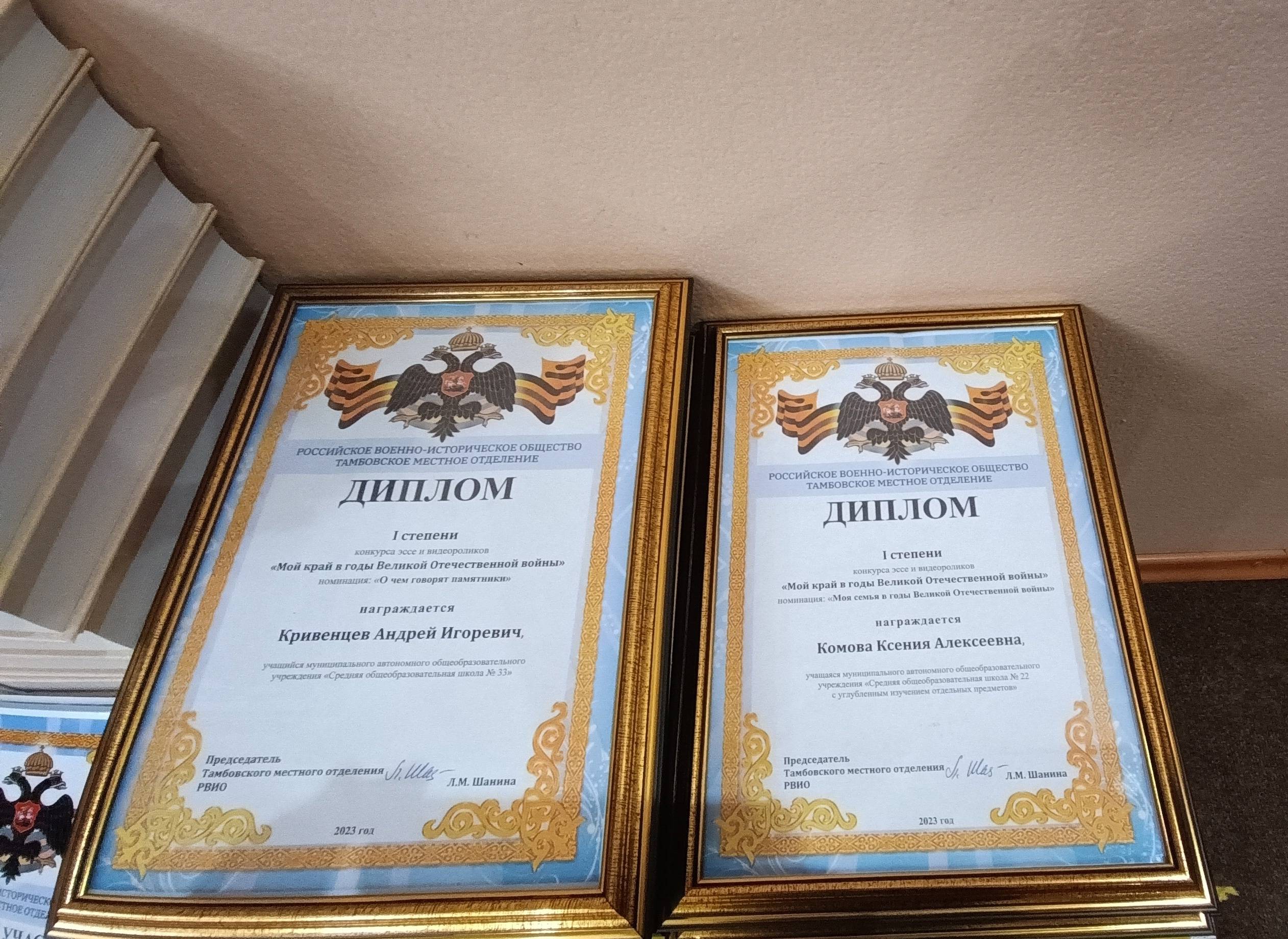 Дипломом I степени награжден и Андрей Кривенцев, учащийся школы № 33, автор ролика «Душа Танка». Свою работу он посвятил монументу, который установлен в центре Тамбова в память об инициативе местных жителей по сбору средств на закупку вооружения для фронта. Благодарности вручили и педагогом, которые помогали ребятам готовить работы и вместе с ними провели большую исследовательскую работу.