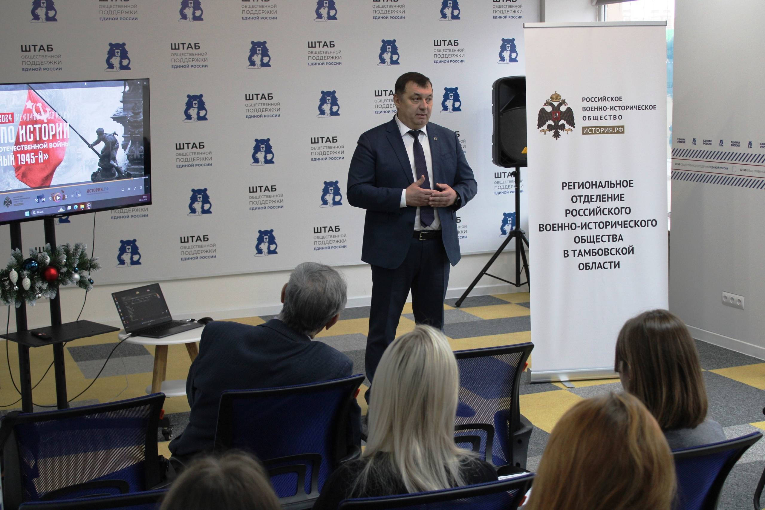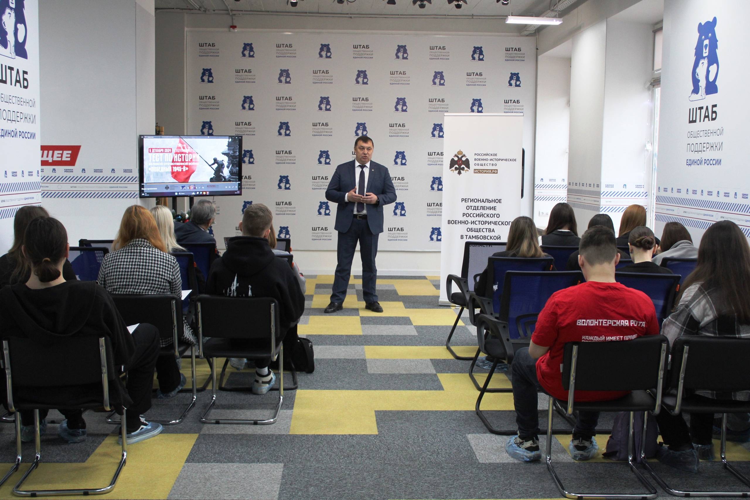 С приветственным словом к участникам акции обратился Советник Главы Тамбовской области, Председатель Регионального отделения Российского военно-исторического общества Тамбовской области Александр Воробьёв. «Сегодняшний тест является неотъемлемым элементом общей просветительско-патриотической работы, которую постоянно ведёт РВИО. Помощник Президента России, Председатель РВИО Владимир Ростиславович Мединский является вдохновителем и автором важнейшего в нашей стране информационного ресурса - портала ИСТОРИЯ.РФ, материалы которого легли в основу этого Теста. Наша с вами задача - не допустить искажения исторической правды о подвиге народов России во время Великой Отечественной войны, передать память о Великой Победе новым поколениям россиян», - сказал Александр Анатольевич.