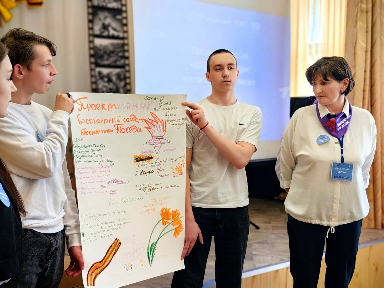 Основной целью проектной сессии стало обсуждение идей, инициатив и проектов, направленных на сохранение памяти о героических событиях Великой Отечественной Войны. Работа проходила в группах, где участники разрабатывали свои воспитательные события, посвященные Великой Победе, в основу которых были заложены конкретные истории Великой Отечественной войны доступные для понимания школьникам, позволяющие им осознать, что вклад в Победу внес каждый в нашей стране. После этого каждая команда представила свой проект.