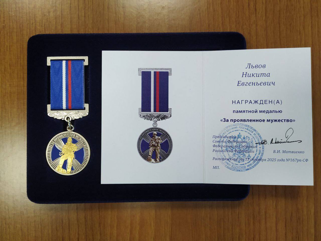 Вручая награду, выразил огромную признательность родителям Никиты: Евгению Михайловичу и Наталье Витальевне, воспитавшим сына, который в минуту большой беды не прошел мимо, не испугался за себя, совершил по-настоящему подвиг.